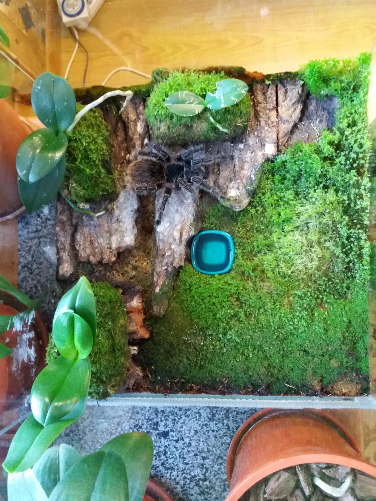 Расскажу историю которая началась около месяца назад. Паук перестал есть и по виду пришло время линьки. И она давай сдирать немного мох возле вентиляции и запихивать в поилку. Я сразу не сообразил зачем она это делает. Вернуть тот мох назад не проблема была но... на следующий день опять все повторилось и так несколько раз. Я начал думать и понял поилка очень близко стоит возле ее "дома" скажем так и она боится при линьке лечь в нее и утопиться. пока была маленькая этой проблемы не было. сейчас она решила зачем ей лужа дома. Я взял и перенес поилку подальше от ее "дома" и все проблема прекратилась мох быстро зарос те шрамы их правда и так почти не видно было. И никаких проблем