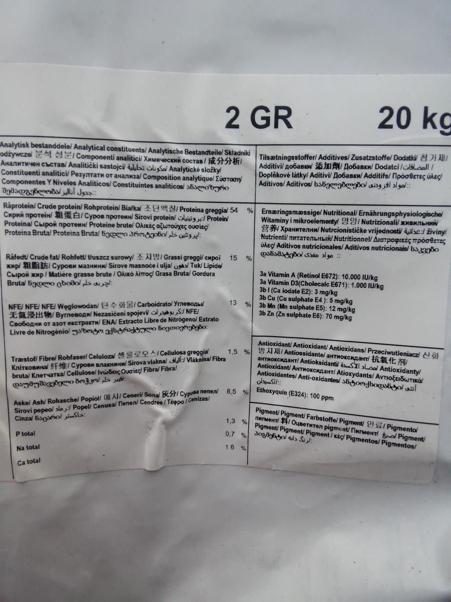 Состав-Рыбная мука,крилевая мука,рыбий жир,пшеница,дрожжи,витамины,минеральные добавки,иммуностимулирующая добавка MacroVital (бета-глюкан,Витамин С и Е )