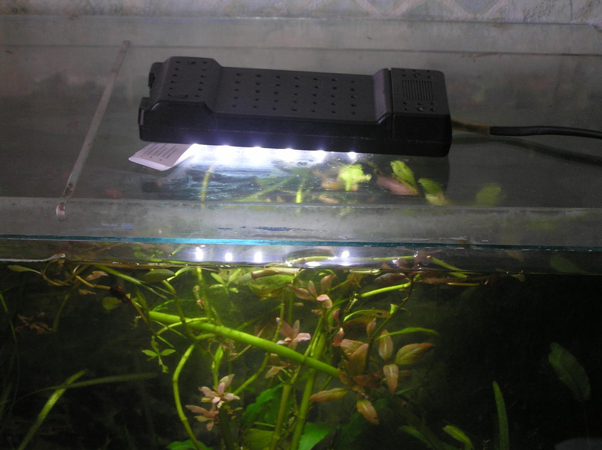 Многие знают у нас на птичне несколько лет торговали разводчики из Запорожья . Они стояли на первом столе от кормовиков . Птичня в Харькове ранняя - с 5 часов утра . Зимой пару утренних часов приходилось подсвечивать фонариком . Так вот у Запорожцев , внутри ширмы , снизу , по переднему верхнему бортику горели светодиоды от аккомулятора , на котором одновременно работал и компрессор . Ленты скорее всего были залиты прозрачной эбокситкой , или чем-то еще , не знаю . Но свет был приятный и рыбу было видно .
