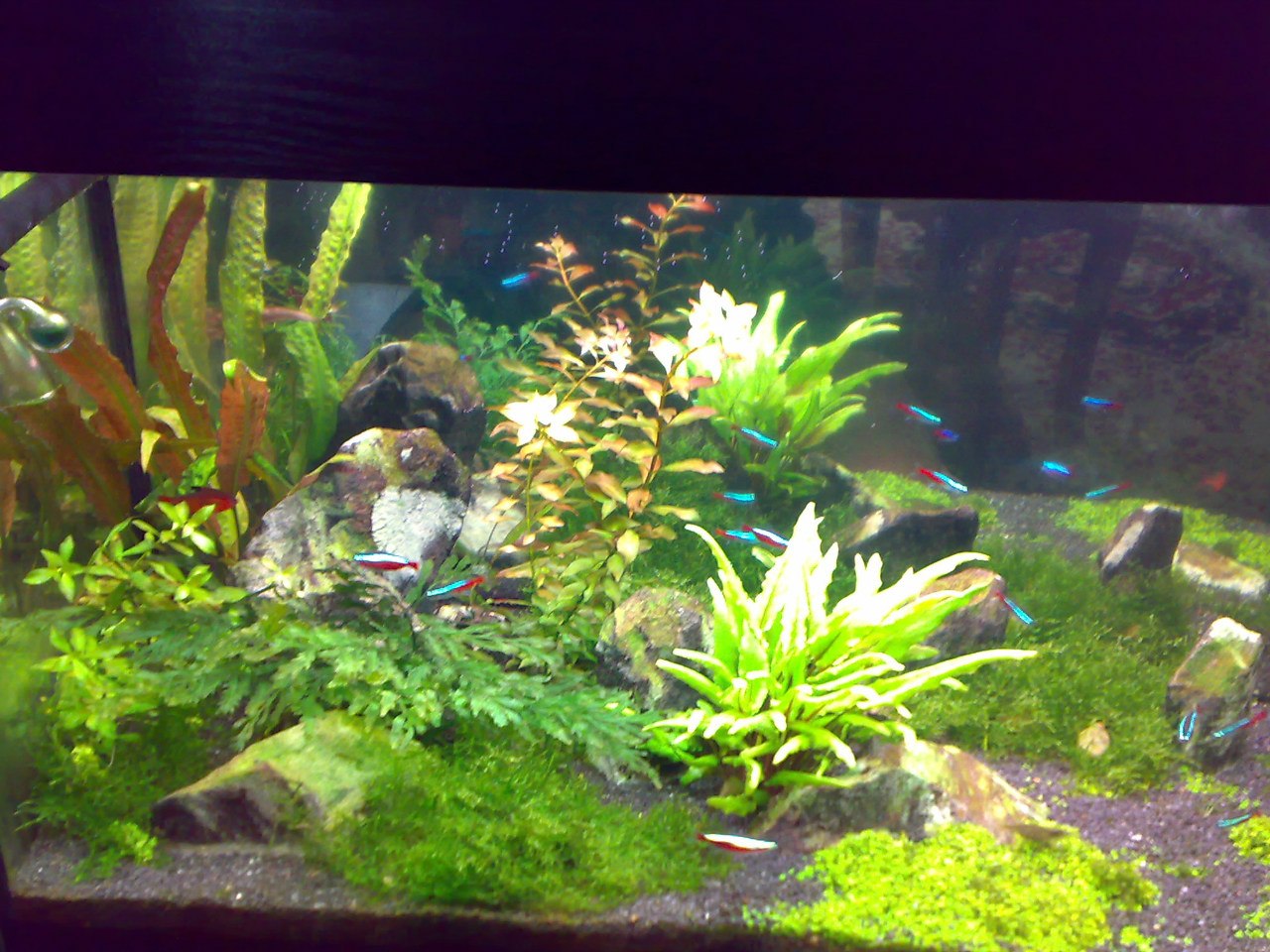 Одесситочка, нашел фото травника с таким фоном, правда качество фото ужасное. Из "+" : визуальный объем увеличивается почти в 2 раза;неонов было штук 10, а казалось что 20, они кстати принимали своё отражение за рыб и часто плавали "одной стайкой", хотя цихлиды всё же умнее харацинки и возможно не будут реагировать на отражение. Возможный "-" в том, что в новом аквариуме будет светлый песок и светлые камни и не будет такого контраста как если бы применялся черный фон. Да и сами рыбы могут смотреться бледно. В общем нужно пробовать и сравнивать. Использую зеркальную нержавейку, потому что могу достать её бесплатно