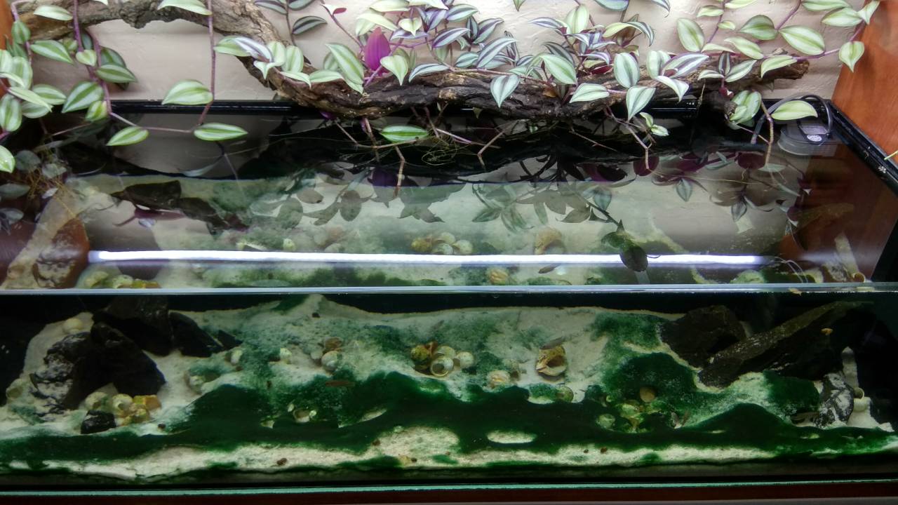 Акваріум трохи заріс зеленими водоростями .  Малечі подобається.