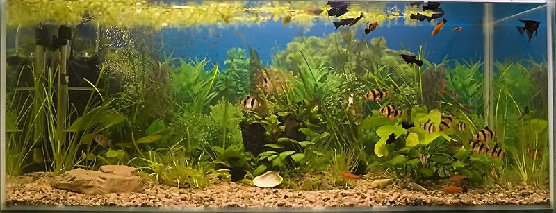 банка на 120л. (80*40*40) из оргстекла ей уже наверно более 15 лет, чего в ней за это время только не было (астрики, акары, пирань, гупи, барбусы, и т.д.) последний раз видно что плавает