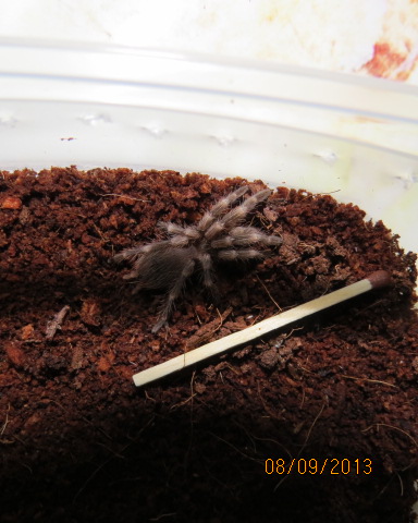 А вот Nhandu chromatus Л2  за трапезой. Паук уже второй линьки, а такой крошечный... Для сравнения рядом коробка от спичек.