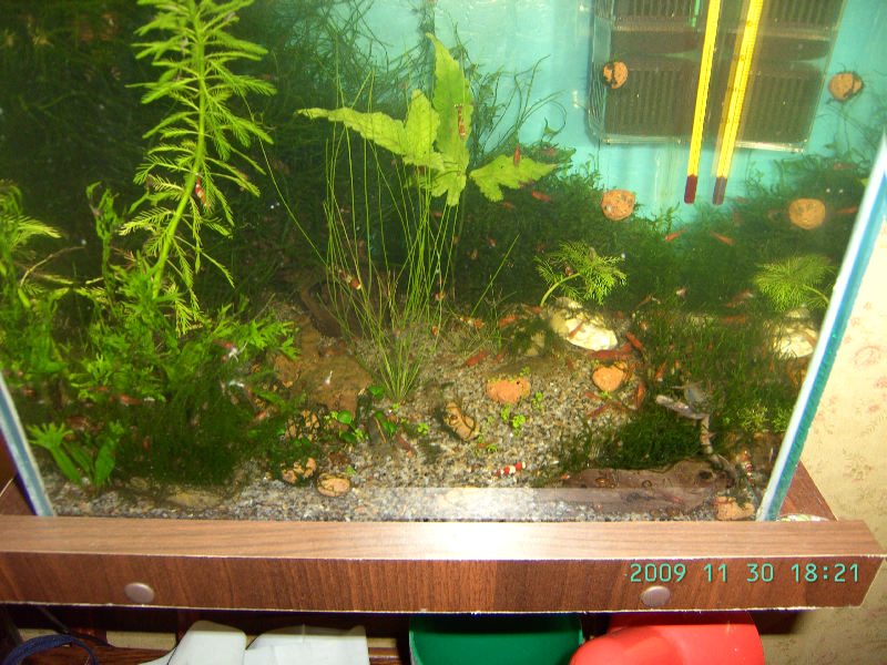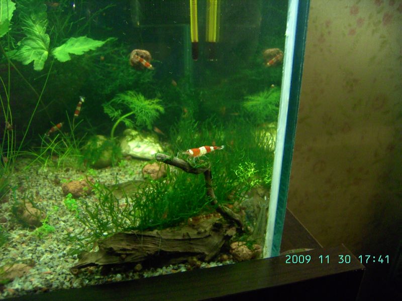 Вчера, после свадебной суеты, добрася до аквариума и обнаружил два маленьких Макробрахиума, рад как слон, а также четыре молоденьких кустиика криптокарин.