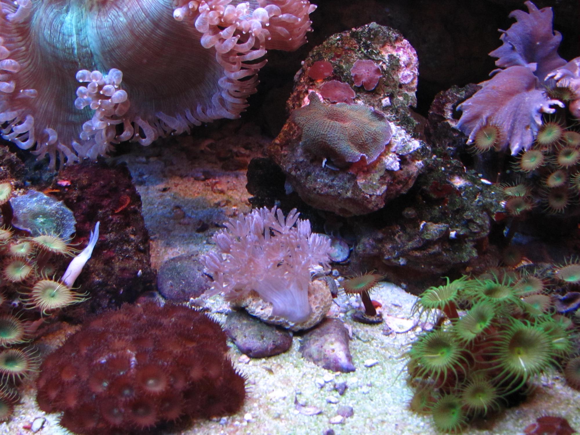 Зарастает.Однако в местах,где освещение совсем слабое, подсыпано небольшое количество кораллового песка,для жителей песчаного биоценоза.Краснорозовые инкрустирующие,зоантусы,грибы и т.п.постепенно закрывают всю зону дна,но еще не достаточно-вопрос времени...Так что песочек не весь убирай...