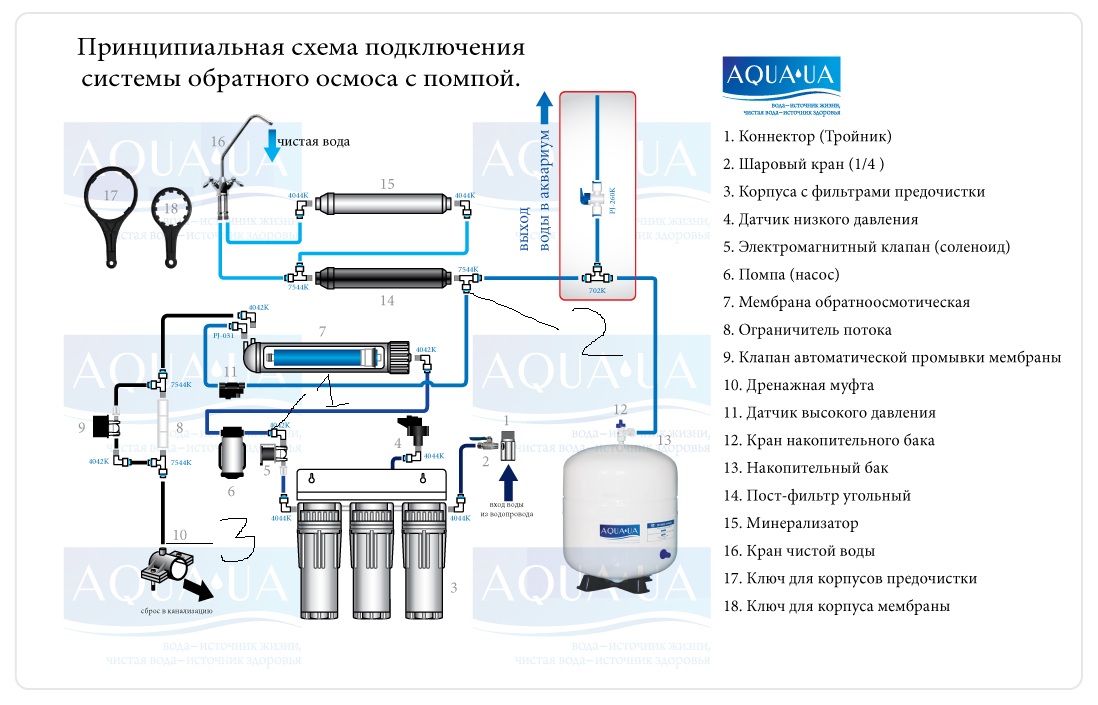 Вся система закольцована, при этом кран на раковине перекрыт, то есть раствор не прогоняется через саму мембрану, а идёт только в месте, где необходима чистка (то есть с наружной стороны мембраны, там где идёт основное загрязнение, а растворённые органика и соли не проходят внутрь мембраны)...