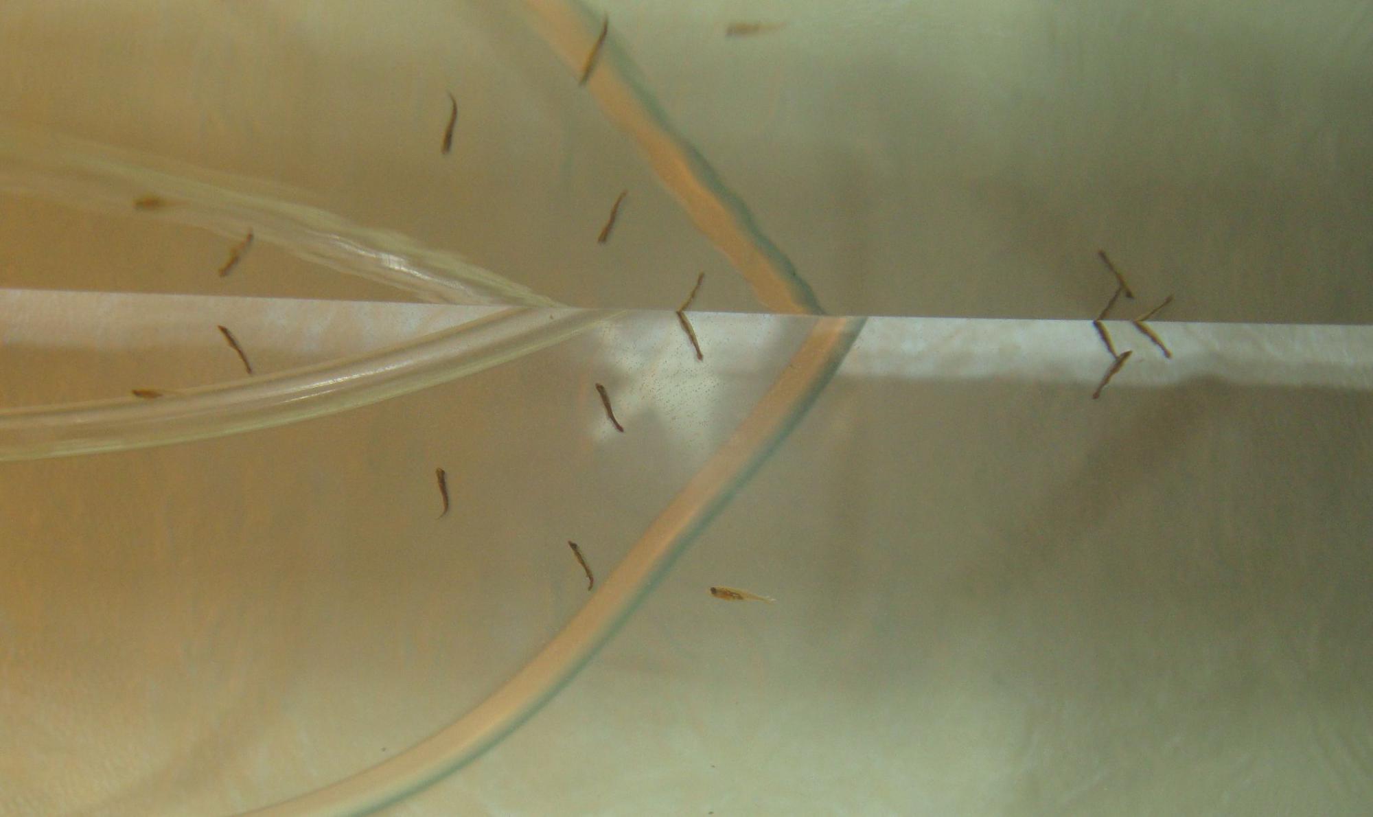 Высаживайте производителей из нерестовика, выключайте освещение и так как икра клейкая, ждите когда появится личинка. Когда она появится, убирайте сетку, нерестовой субстракт, уберите испорченную икру, экскременты производителей и снизьте уровень воды до 7-10 см, продувку не убирайте. Как поплывут (у меня на четвертые сутки) надо дать первый корм, лучше всего прудовую коловратку. Вместе с первым кормом в аквариум положите немного мха и штук 5 улиток, мне больше нравятся катушки, от ампулярий много слизи. Установите слабое освещение, я ставлю лампочку накаливания 15 Вт. Каждый день каплями добавляйте в аквариум с личинками воду(примерно 10% объема) из аквариума, в котором будете их выращивать в дальнейшем. На четвертый-пятый день я начинаю давать науплию артемии. Как дольете воды до полного акварима, решайте переводить в выростной аквариум или делать первую уборку и продолжать кормить в этом аквариуме.