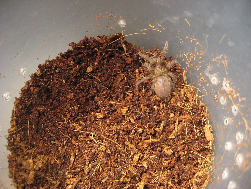 За останніх два місяці поліняв мій павучок,зараз 1.5 см (Л3 або Л4) по тілу,свій екзувій виштовхнул із своєї нори після того з"їв двух великіх "мучняків" .Сьогодні пересадив його в більшу ємність,поки вигнав його з тих лабірінтів ,що він поробив...