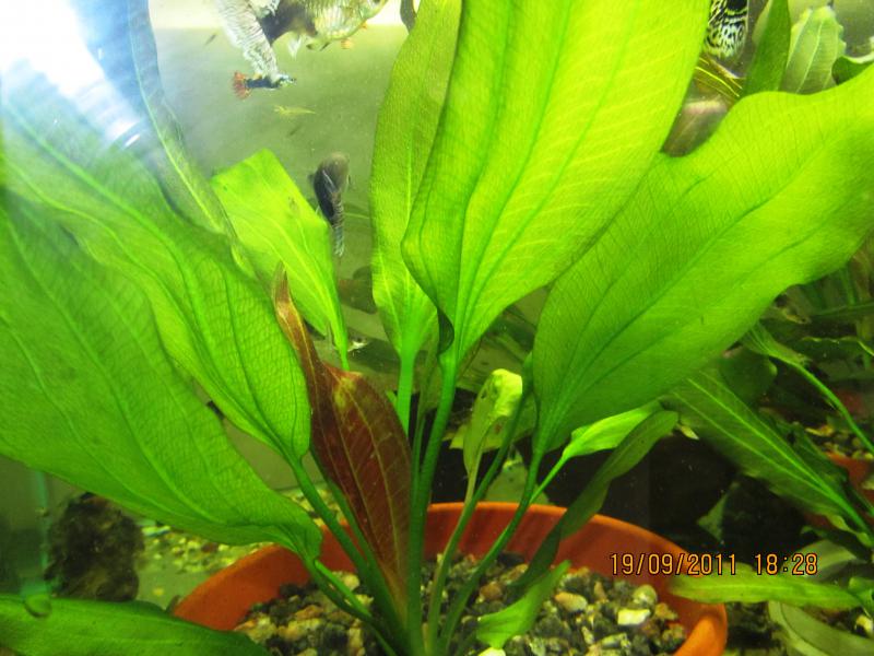 НА фото Солнечный кормилец- это не сильно распостранённый гибрид Филиппова, цвет передался плохо в реале пару первых листьев розовые , пару желтоватые, остальные желтоватозелёные приятного оттенка, листья плотные , глянцевые держатся очень долго, черешок короткий, жилкование явно выражено. В содержании проблем мне но доставлял, растёт довольно быстро, очень любит подмены воды. Пока это подросток о размножении говорить рано но по информации автора стрелкуется без проблем
