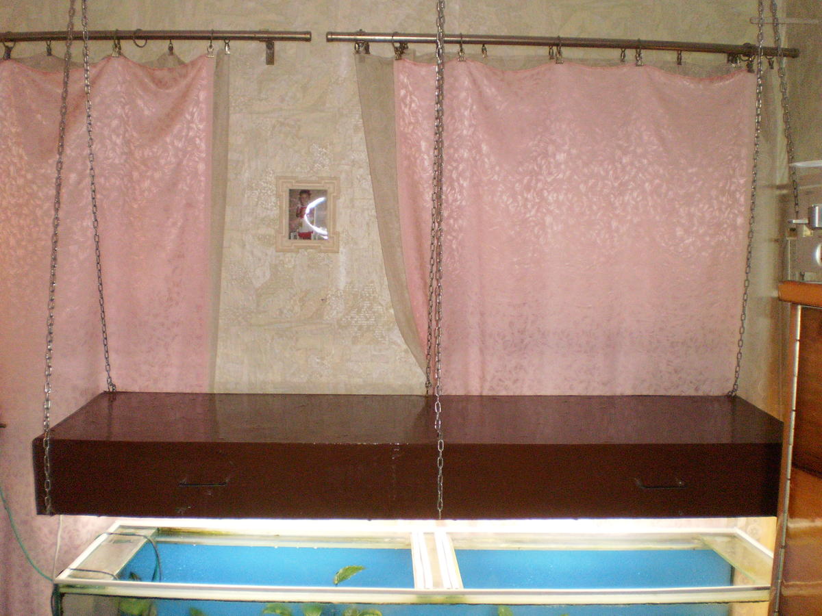А прикол весь ребята в том,что раньше крышка лежала просто сверху аквариума(а она очень даже громоздкая),а теперь,для минимизации и удобства обслуживания,я её пришпандёрил на цепях над теплицей(вот это мне стоило немалых нервов).