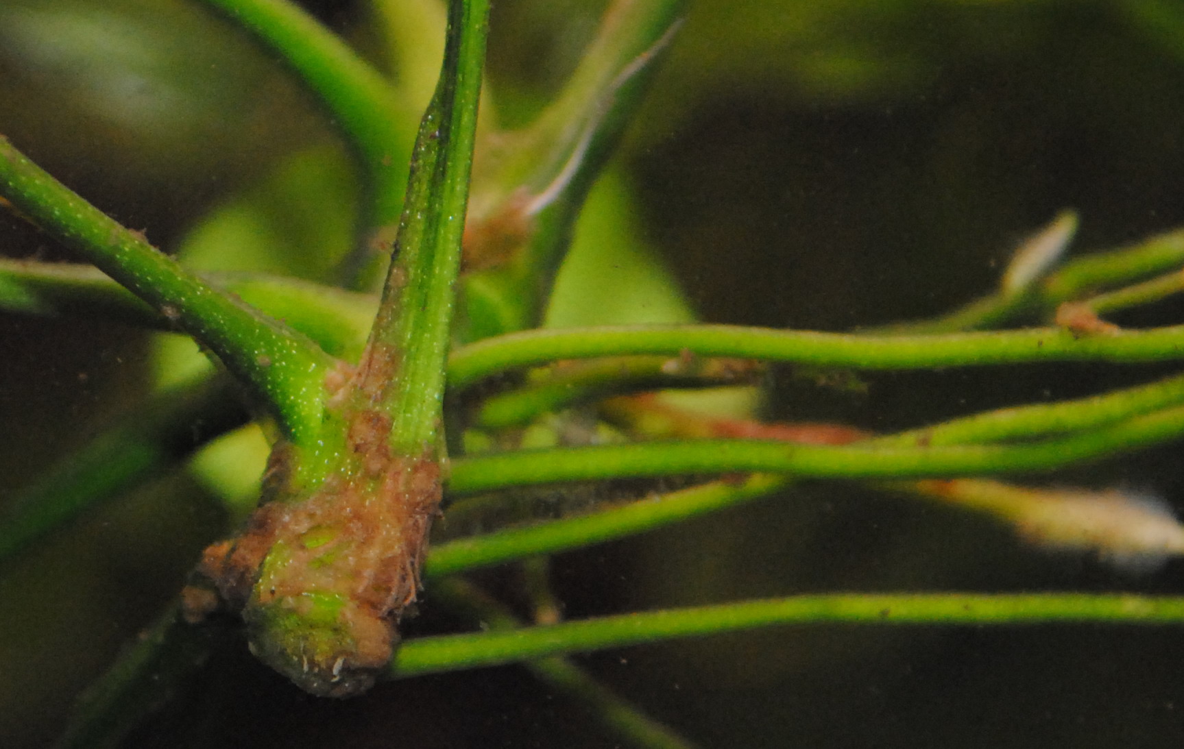 Собственно проблема: до этого были у меня два куста анубиас-нана, более года росли отлично и проблем не было. С какого-то момента на ризоме (в основании листьев), а потом на самих листьях и корняз стали появляться рыже-коричневые пятна, или вернее какая-то рыхлая масса, которая со временем покрыла большую часть ризомы, черешки листьев и сами листья. В итоге растения сначала начали мельчать, плохо расти, листовые пластинки были покореженые и в итоге растения погибли. Через месяца четыре после я приобрел еще два кустика анубиаса (к сожалению не могу уточнить какой именно). Сейчас на них стал появляться опять тот же рыже-коричневый рыхлый налет, который уже начал разрушать ткани растения (вся ситуация видна на прилагаемом фото).