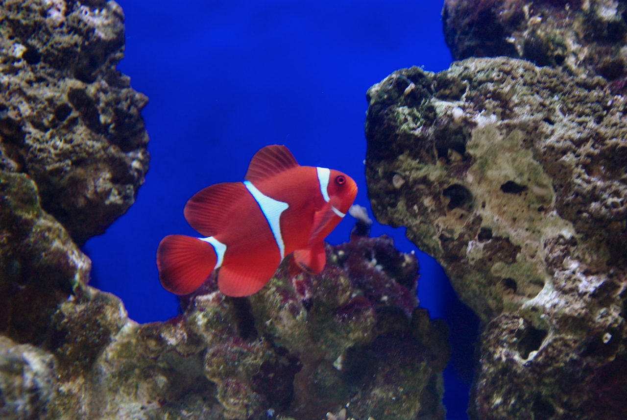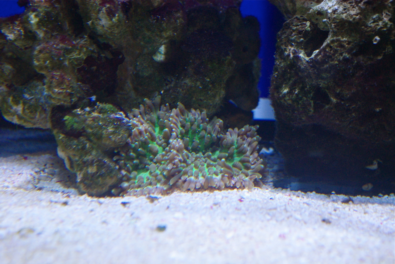 Всем привет, аквариум постепенно созревает, водоросли пока не особо проявляются, немного на грунте рыжих водорослей, наконец то заработал пеноотделитель, начал гнать пену, еще не особо много, но все же работает. Сегодня посетили фирму Сергея Марченкова, было приятно пообщаться, не удержались и были приобретены 2 новых жильца, Премнас и актиния Хетерактис, правда она совсем небольшая, при посадки в аквариум долго ее мотало по дну, пришлось на время отключить помпы и за 20 минут актиния уселась под камень, Премнас быстро освоился и к вечеру начал брать корм. Пока все.