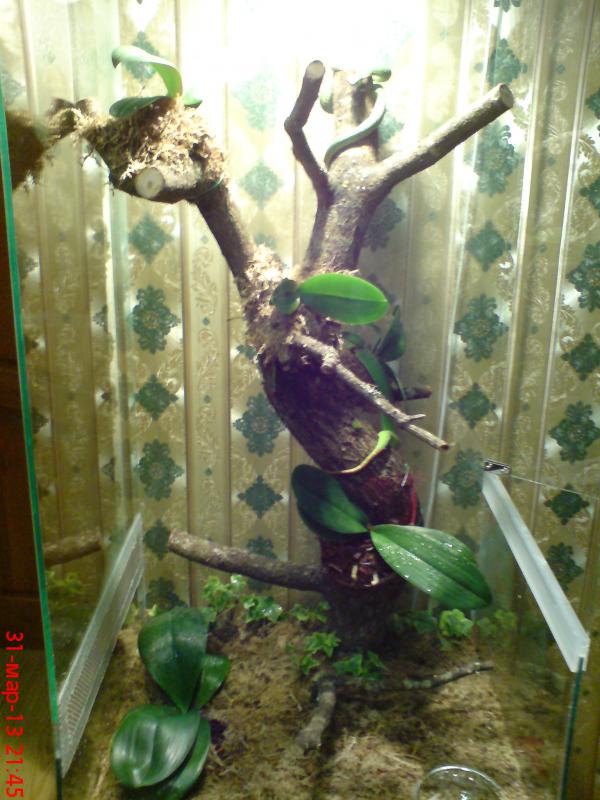 еще при задумке террариума и заведения змеи я решил что обязательно посажу в террариуме орхидеи фаленопсис. что и было осуществленно в скором времени. что получилось и как смотрите на фото. орхидеи садил так: делал мячик размером с кулак из мха сфагнума . ложил его на место посадки орхидеи . потом сверху ставил орхидею расправлял корни. сверху корни опять прыкрыл мхом сфагнумом и примотал леской 0,8 мм (можно и тоньше 0,4 смотря какое животное там будет). 2 раза в месяц поливаю органическими удобрениями. а все остальное время оприскиваю .сейчас после порошествия месяца после посадки орхидеи уже приросли корнями к коряге и пошли активно в рост. попускали все молодые листочки. как зацветут сфотаю и покажу. если у кого то возникли вопросы пишите. вот тема про мой террариум http://www.aquaforum.ua/showthread.p...31#post2338431