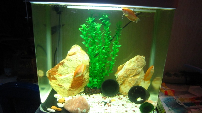 Супруге стало жалко рыбку(выросла в два раза с момента спасения и стало тесновато в 10ке) и она купила 40л китайскую упакованную банку(весь декор-остаток от основного),а в 10л заселились 5 неонов 2скалярии и сомик купленные ей в тот-же день.