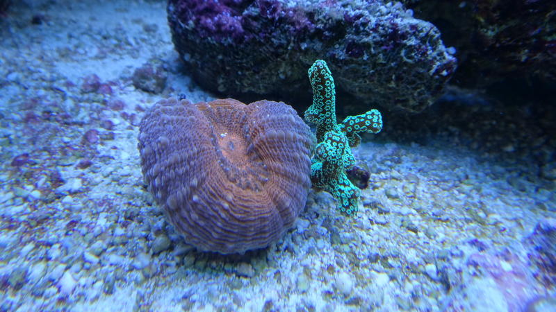 Сегодня ночью случайно обратил внимание, что фраг серитопоры бирюзовой покрыт паутиной, думал, что течением принесло, а на утро она уже вся облезла, остались только кончики... очень жаль, кто мог ее так ... рядом копошился стромбус, а может и не стромбус?не успел выше поставить, все потом...дождался...Теперь голый скелет
