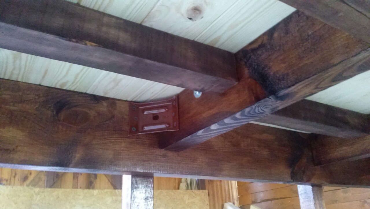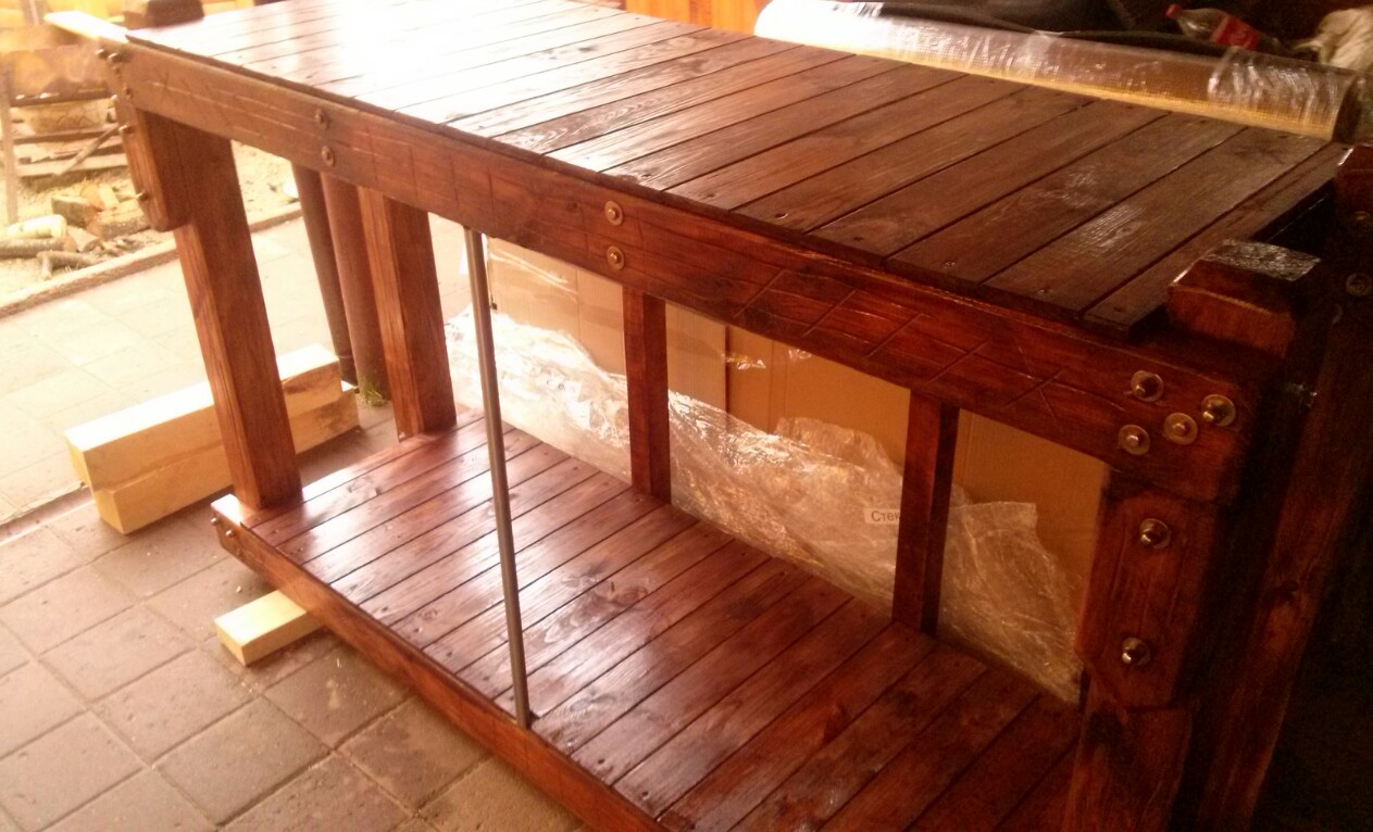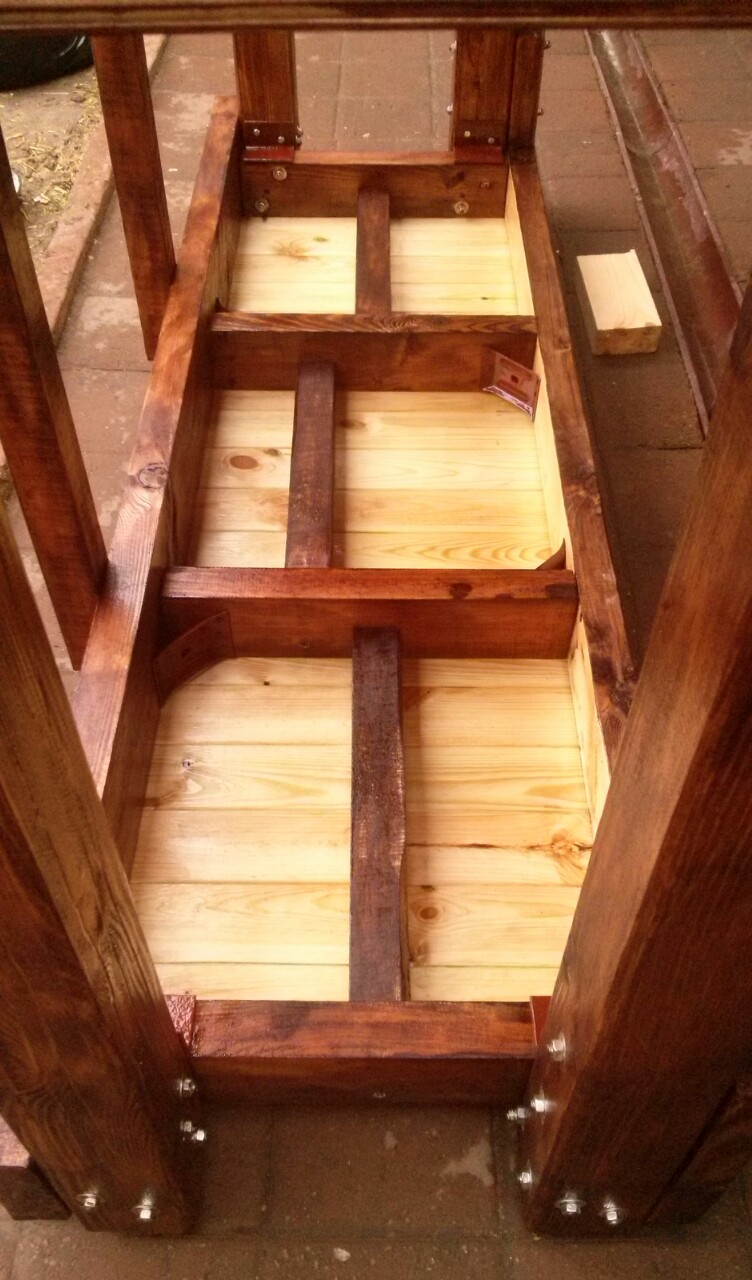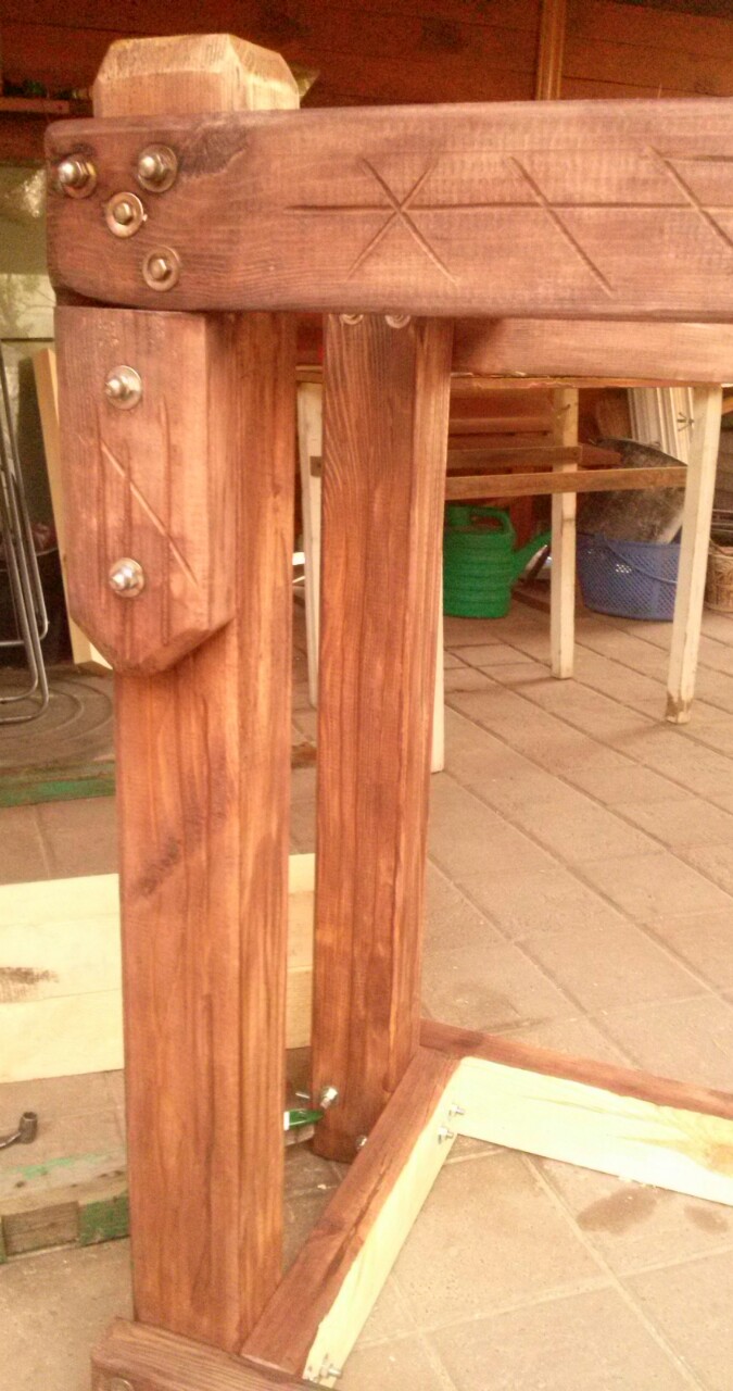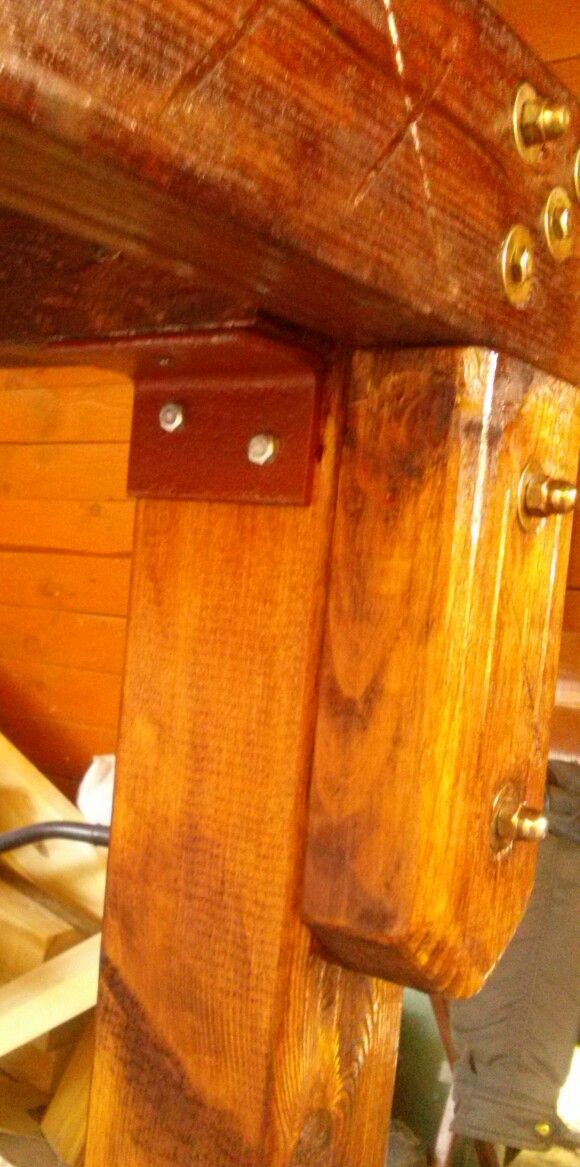 Также все " несущие" горизонтальные доски продублированы с стальными уголками 50*50*3 мм. Вскрыл мебельным лаком. Думал пропиткой терассной, но цены выросли- космос. Лак тоже нормально. Уже стоят у меня три деревянных стойки не один год- без проблем.