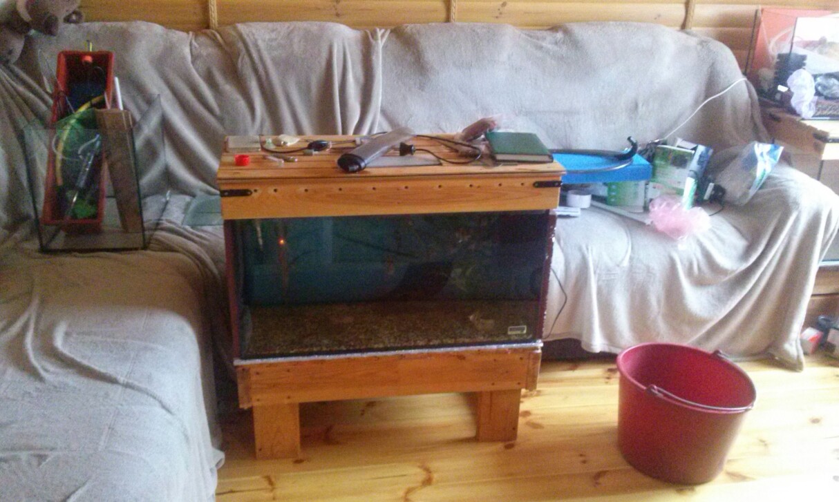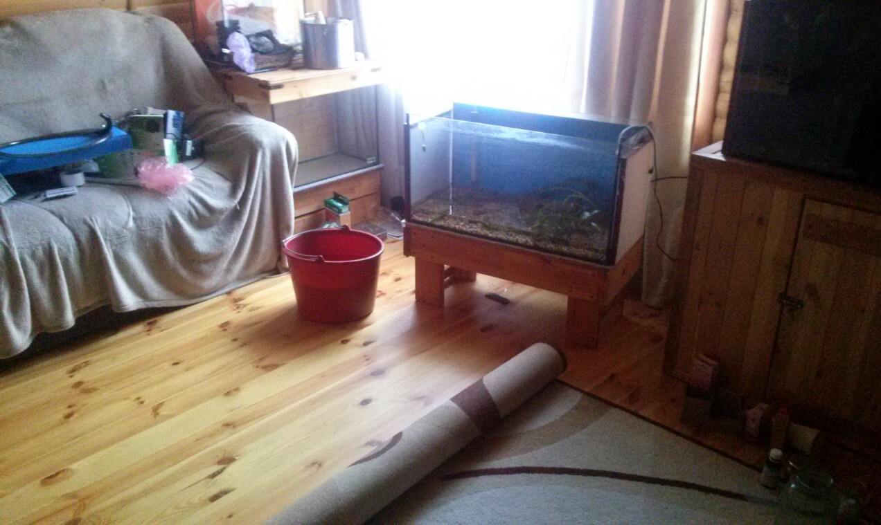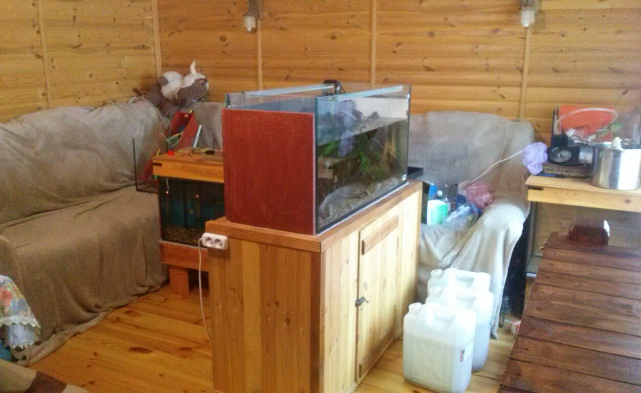 А потом в доме начнёться полный переворот: прийдёть на время переселять рыбу, сливать 200 л коряжник, сотку, что рядом стоит- тоже сливать. На том месте будет стоять новая стойка. А для 200 и сотки сделаеться стеллаж поменьше. И поставиться рядом.