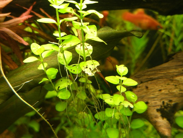 Первыми - людвигия. На старых листьях стали появляться дырки мелкие, причем чем менее освещенные листья были тем дырок было больше. Потом начинается отмирание (коричневение) стебля у верхушки, опять же не вверху а на нижних побегах.