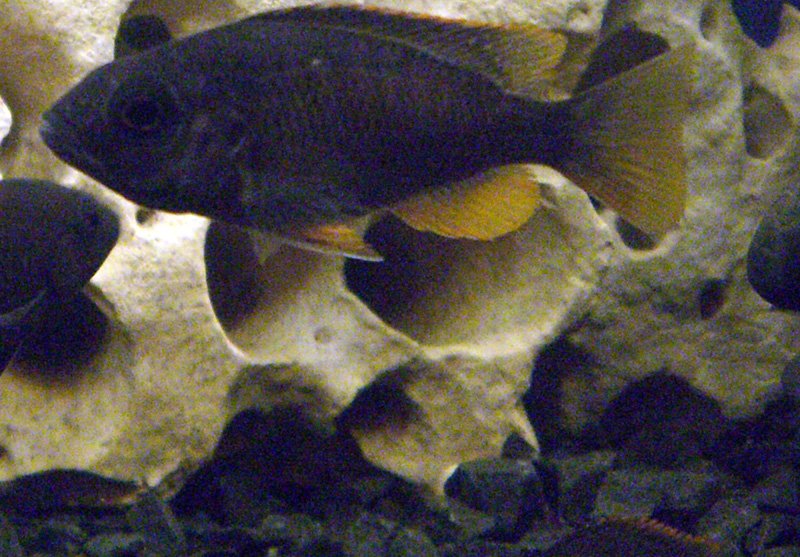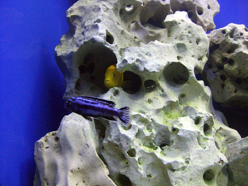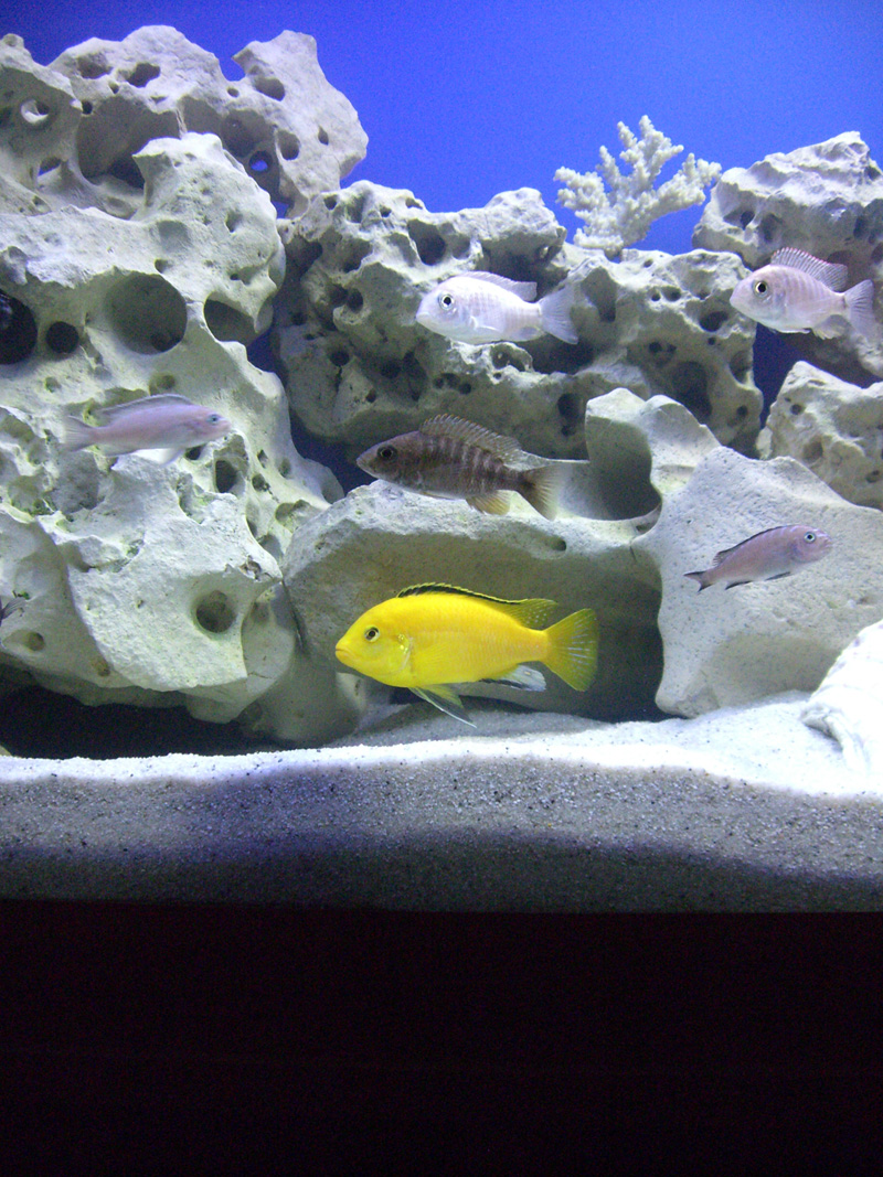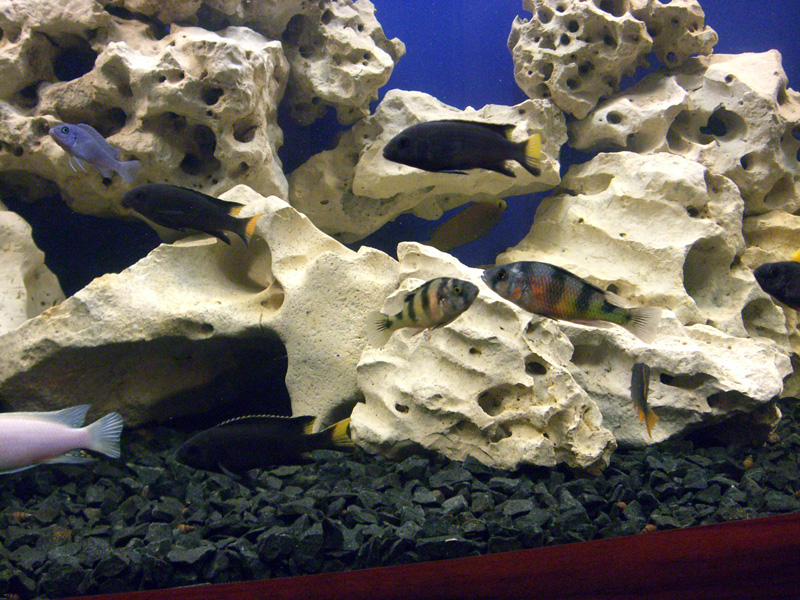Рыбки выглядят симпатично,но как было уже подмечено выше сливаются с общим фоном, неярких цихлид предпочтительные размещать в аквариуме с растениями,яркие же хорошо оживляют интерьер подобный вашему имхо. Хотя понимаю что делалось все из лучших побуждений дабы воссоздать естественное окружение.