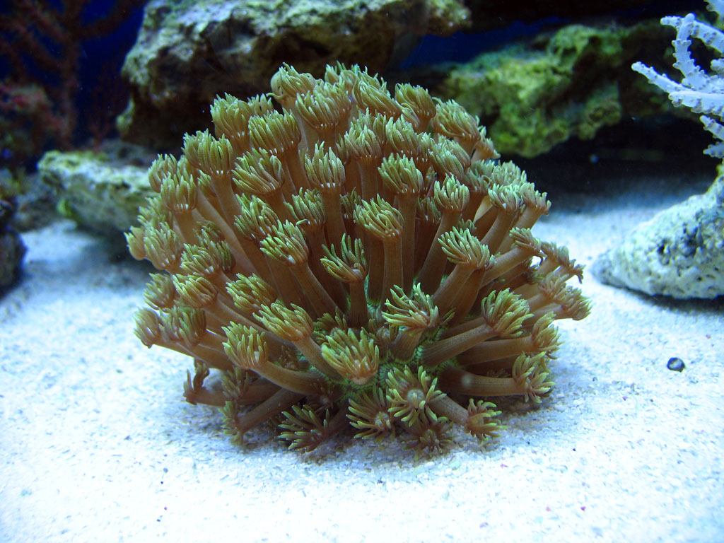 Когда я его только принес, не мог поставить - полипы раскрывались, но свисали к земле - пришлось положить на камушек горизонтально. А через пару дней я заметил, что полипы становятся все прямее и крепче, и решил поставить его вертикально в песочек между камушков. Стоит )) Открывается и вроде нормально кушает. Попробую как-то днем сделать его фото в "полный рост".
