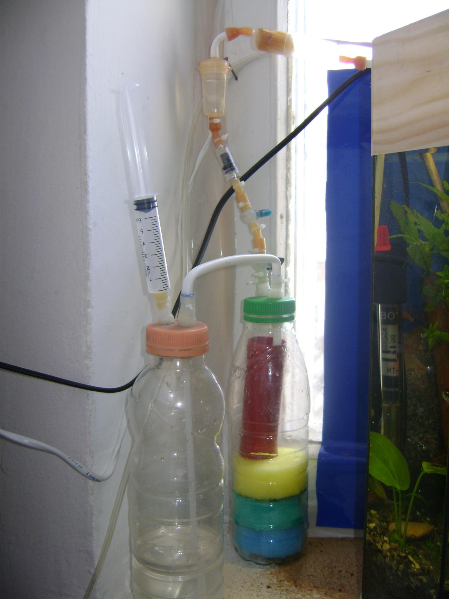 Запуск, он производится очень просто, перекрываем кран подачи СО2 в аквариум и сдавливаем рукой бутылку с кислотой, выдавив немного ее в соду, реакция начинается мгновенно и давление в обеих бутылках резко увеличивается (1-2,5 атмосферы).