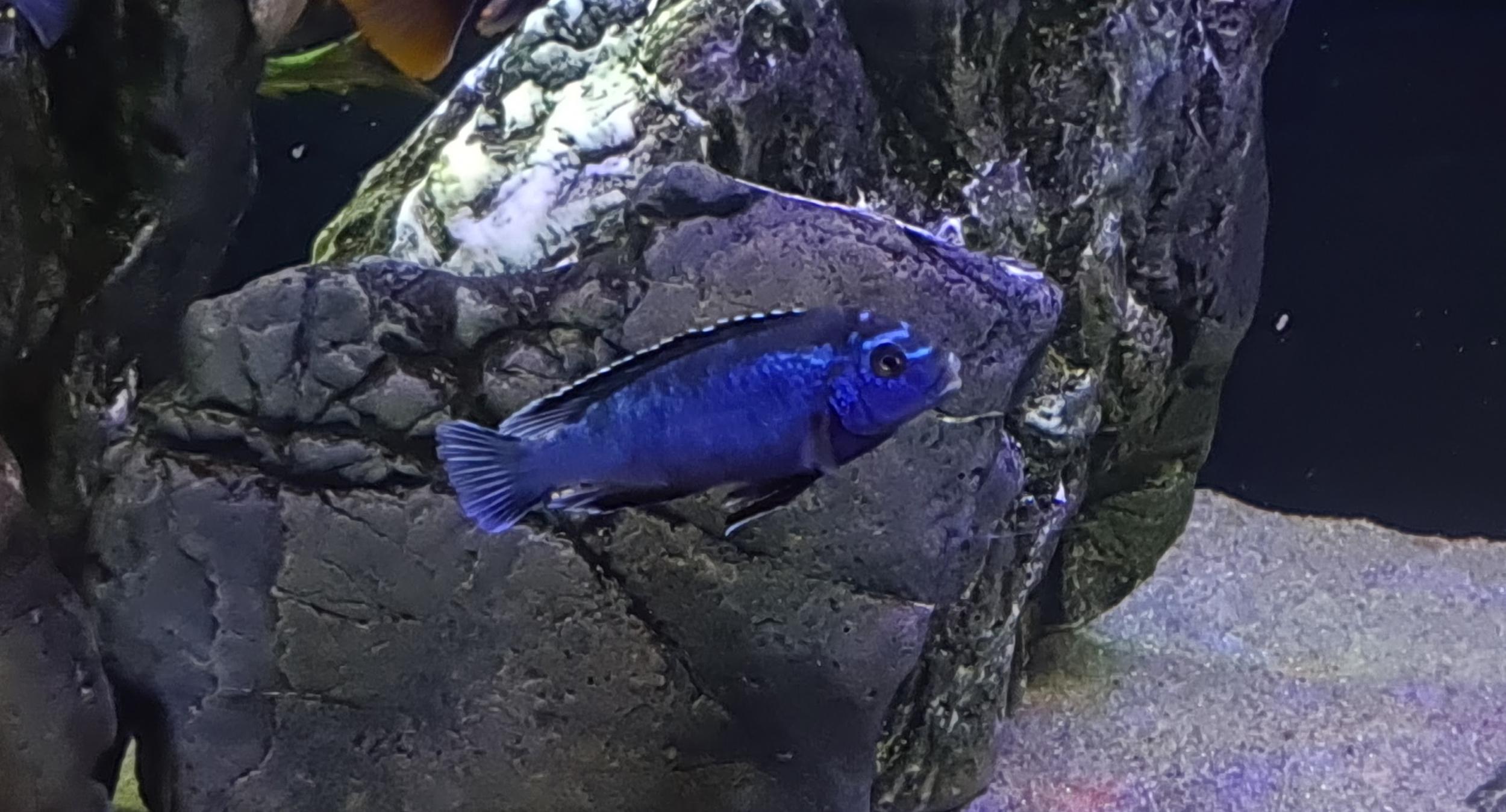 Власть в аквариуме сменилась! Долгое время за старшего был здоровенный самец Мetriaclima tarakiki (где-то 14-15 см), но за последние две недели самец Metriaclima fainzilberi Maison Reef заматерел окончательно! Несколько серьезных боев между ними и уже мэйсон занял всю правую сторону аквариума, постоянно яркий цвет, а таракикки теперь плавает в общей группе и чаще бледно-голубой, а не яркий.