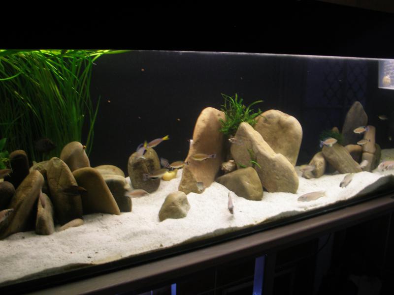 Недавно запустил новый цихлидник . Пока что он "заряжен" на Энантиопусов.Скажу честно что даже такая площадь дна (200х50 см.)не вполне комфортна для 4 самцов.Для 3 в самый раз.Для средних и верхних слоёв воды пока что не могу определиться с рыбой(т.е какую брать можно знаю, но какую именно хочу-не решил)