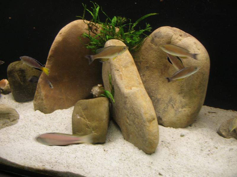 Моё новое приобретение-Telmatochromis vittatus.Хоть и Hendrix писал что этот вид легко найти у нас,но кроме как у него я не увидел больше кто бы содержал этот вид(может плохо искал).Пришлось везти из Москвы.Пока не разбежались по норам успел сразу сделать фото после "загрузки" в аквас из пакетов.