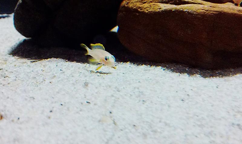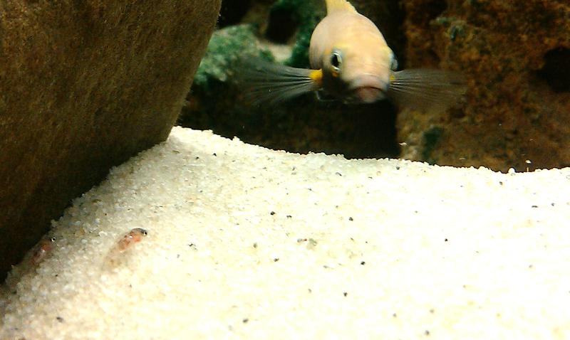 Пока всё идёт по плану.За девять дней малёк заметно окреп,уже не держится кучки и плавает где хочет.Питание 4-х разовое состоящее из планктоно-моино-циклоповой смеси с добавлением сухого корма для кораллов.Самка пристально следит за своим семейством.