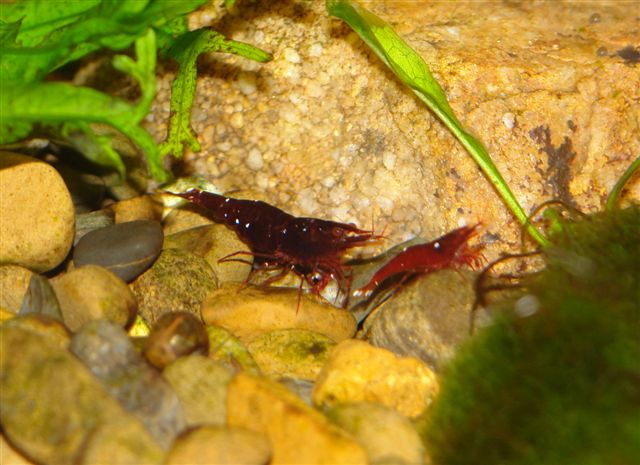 Бог с ним, выяснили что это не креветки, и ладно. Прозрачная, что носила икру, сбросила. Странно, 1 и 2 партия сидят в одинаковой воде, в практически одинаковых условиях (отличие только в цвете грунта, 1 партия - чёрный, 2 партия - сначала вовсе без грунта, потом белый, оба нейтральные)... А результат разный...