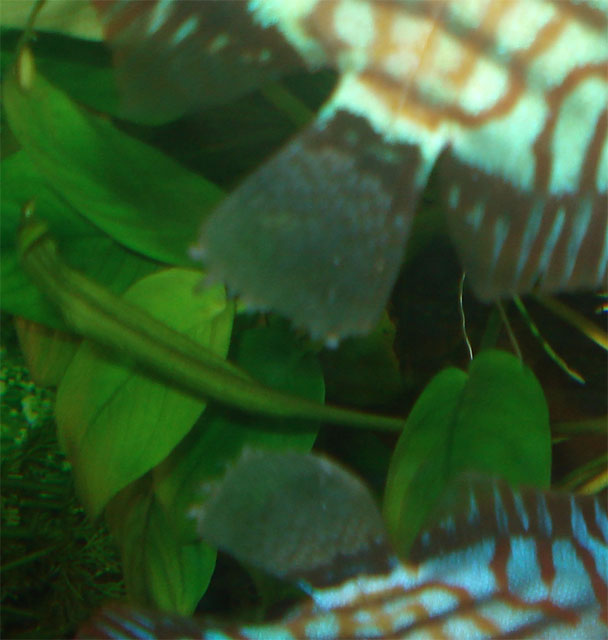 Утро - температура воды 32, все диски плавают в стае, кормил артемией и морож мотылём - вяло, но ели! Плавники выглядят лучше и расправлены.
