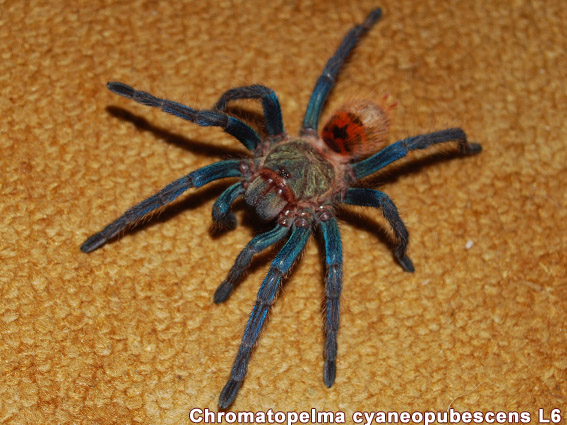 Chromatopelma cyaneopubescens. Единственный представитель своего рода. Этот удивительный птицеед обитает в северной Венесуэле. Является одним из самых красочных птицеедов.Он обитает вдоль реки Paraguara , располагаясь в кустарниках и прибрежном лесу. Местность полупустынная.