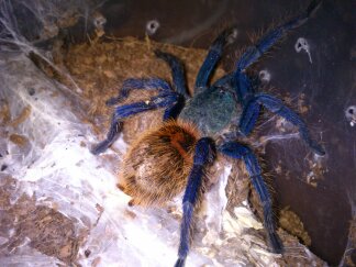 Примечание: Хроматопельма - "сухой" вид паука ,чрезмерное увлажнение может его убить . Плетёт очень много. Лучше держать без увлажнения грунта с поилкой.