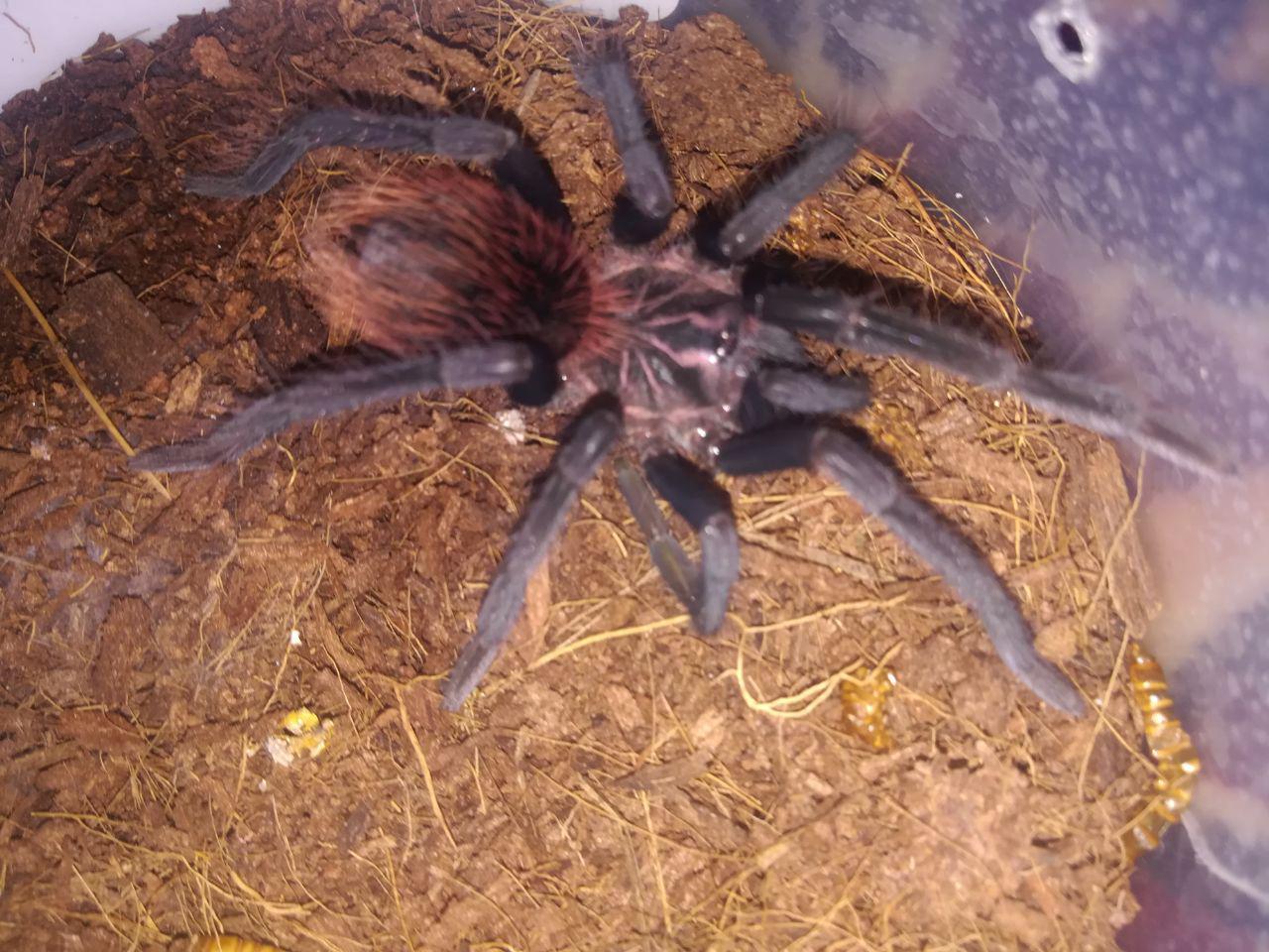 Xenesthis Immanis FM в новом доме и сразу за обед 🕷️😁, аппетит у них отменный, заселяешь в новый террариум кидаешь корм сразу набрасываются. Отличный паук даже для начинающих, дорогой правда.