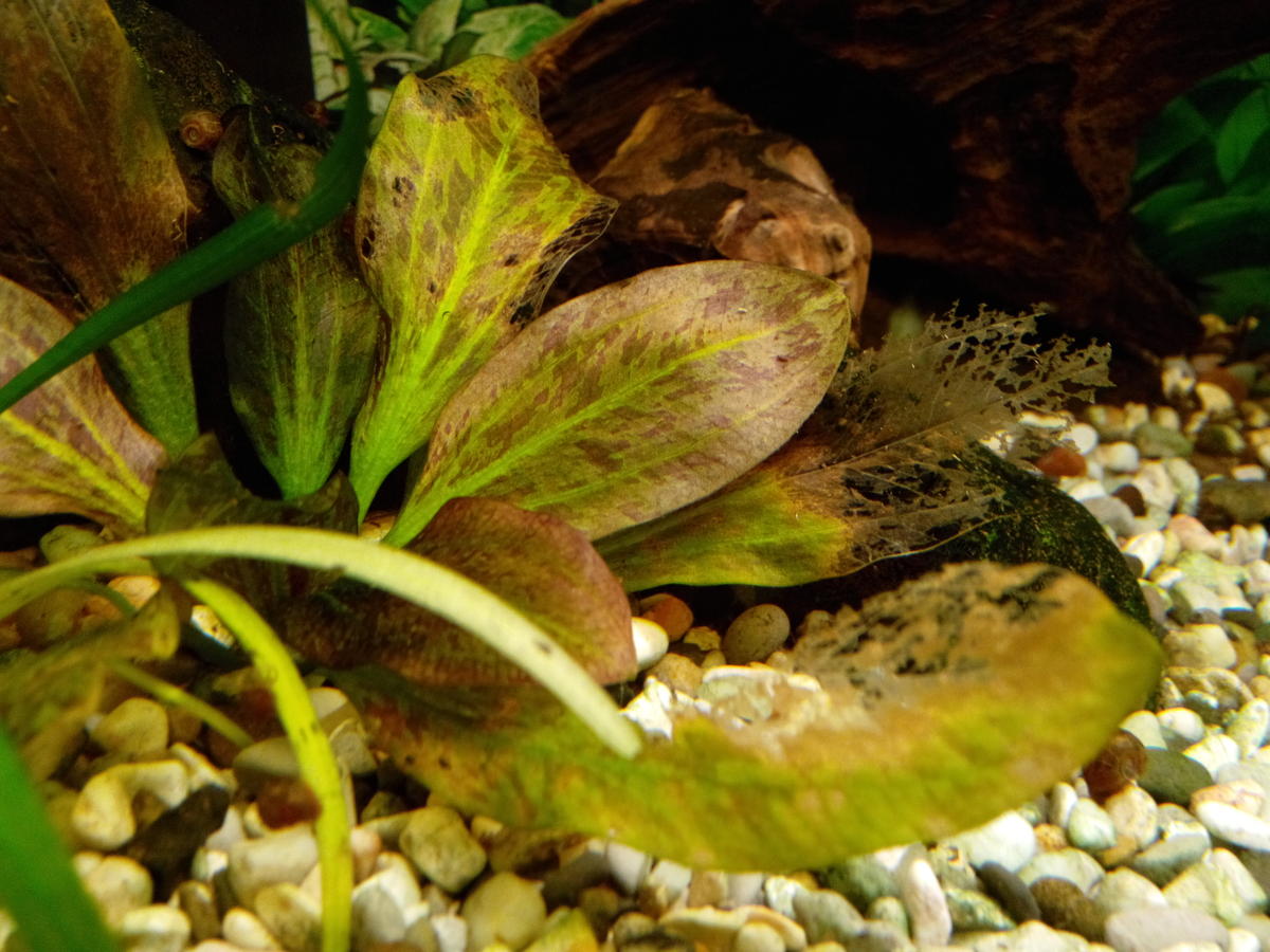 супер!  ,но они не всегда такими будут,как показывает жизнь...  Если кусты высажены недавно,то процесс отмирания и обновления-это нормально,но стоит копнуть в сторону азота,уж больно шустро идёт процесс разрушения.Мой вам совет-не тревожьте кусты,посадили и пусть растут,не нужно постоянно осматривать упругие корни,любая пересадка для молодого эхинодоруса-это стресс  .Тестируйте воду и приводите в норму параметры и концентрации макроэлементов,лезть в корневую зону -это последняя мера.