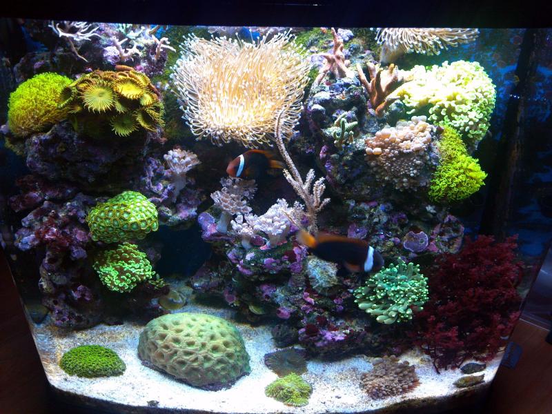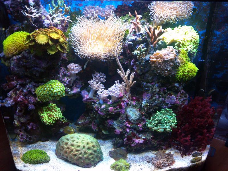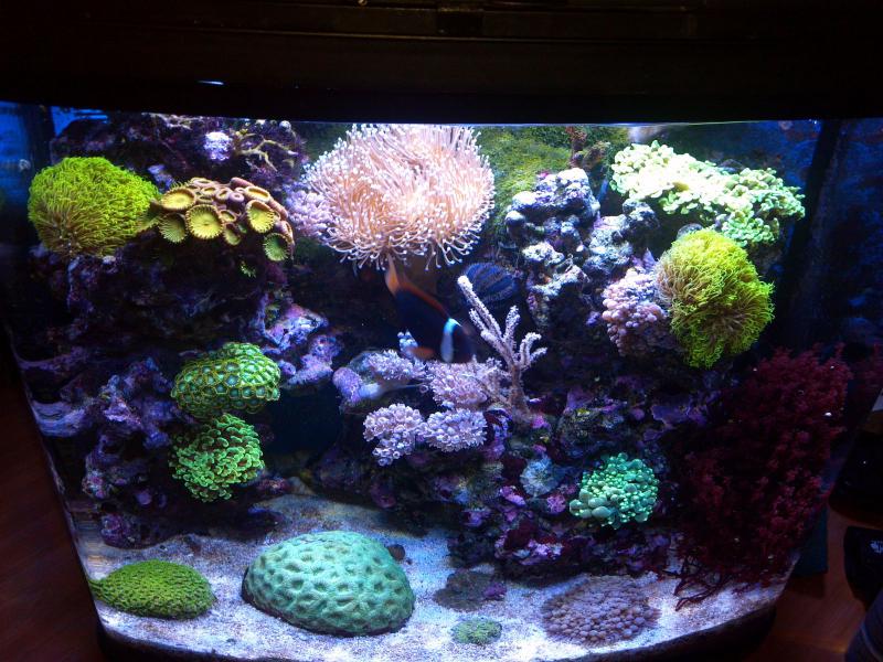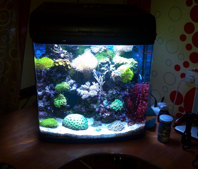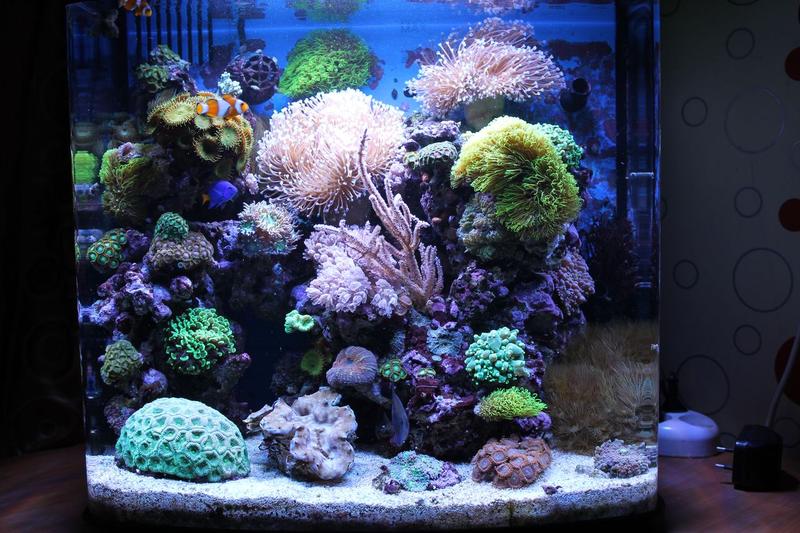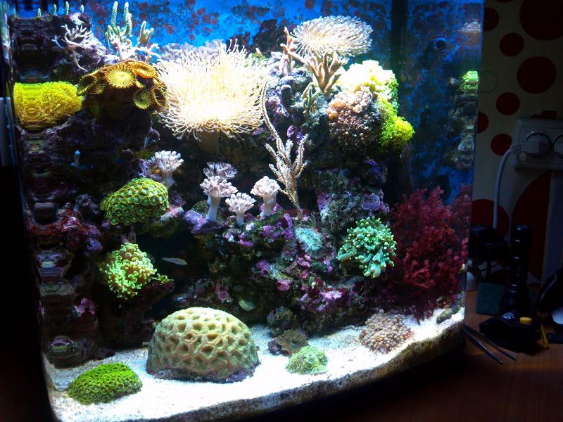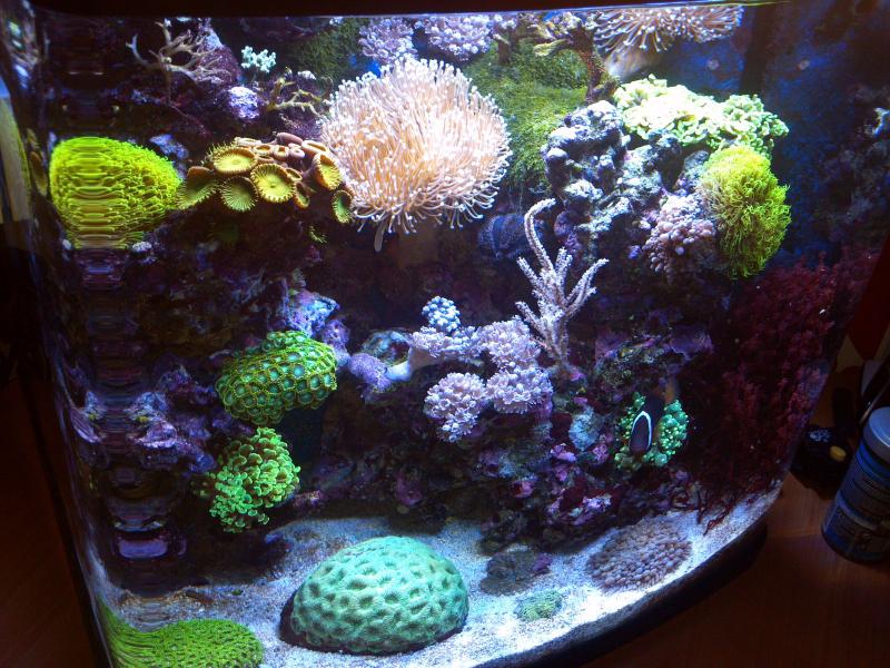 Изменений достаточно много: поменял клоунов на оцелярисов,поскольку томатные уже не помещаются. добавлены коралы- несколько колоний зонтов,дункан,политои,паразоантусы,родактисы и так,по мелочи. И вот недавно тридакна 12 см появилась ...наблюдаю. Пытаюсь разобраться сколько кальция надо добавлять и нужно ли вообще.