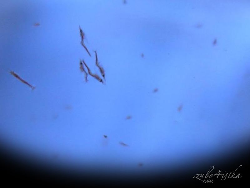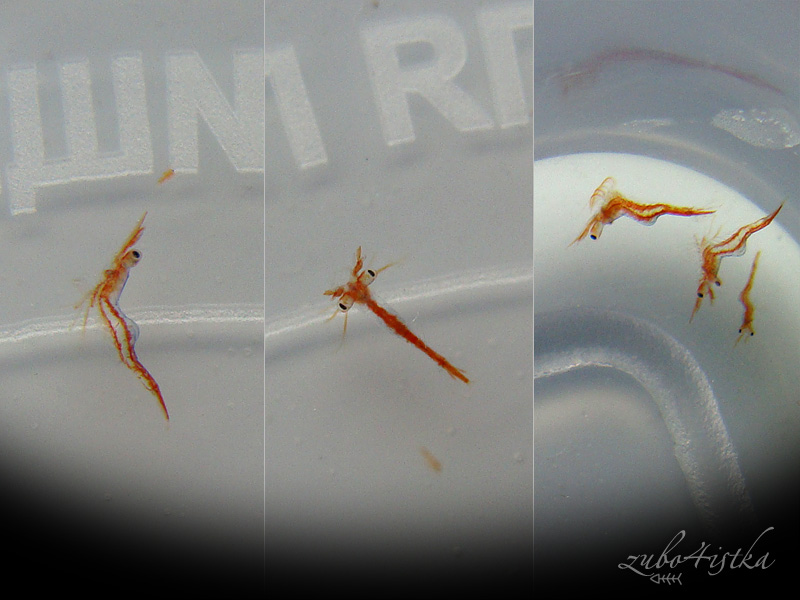 Т.е. теперь жопка отогнута назад, и да, это очень напоминает взрослую Секси. Держатся в основном на дне, пытаются сидеть на лапах, выходит плохо, часто валяются на спине, и их сносит течением. Окраска таких личинок бледнее, возможно, постепенно проявится нормальный цвет взрослой креветки (если все-таки метаморфоза прошла). Но уверенности в том, что это и есть готовая мелкая креветка, нет никакой. Если считать метаморфозу случившейся, то она началась у отдельных особей 4 дня назад и идет до сих пор.