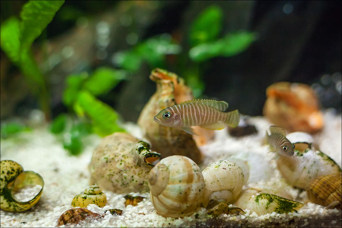 Самочка Lamprologus brevis на охороні кладки в ракушці