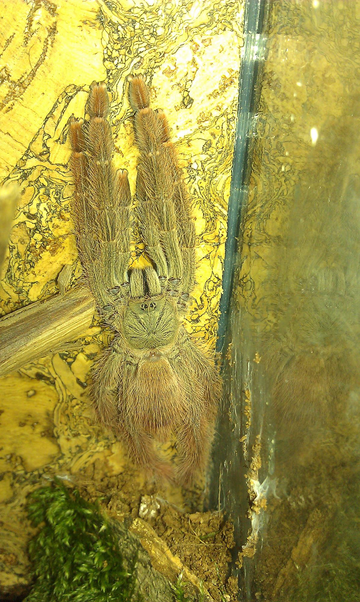 На этой линьке появилась взрослая расцветка.Её козырь - общий цвет гнилой вишни. На фото паук при ярком освещении и приглушенном.