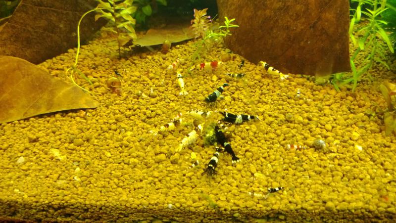 Аквариум около 240 литров, воды - около 220-ти; фильтр fluval 405; грунт Ада Амазония Нью, высота от 3-х до 7-ми см (включая Аду пудру, слой которой около 2-х см). Вода: осмос, реминерализованный CaCl2 и MgSo4 (соотношение 5:1); нитрат и фосфат нулевые, Ph=5.2-5.5, Gh=5-6, Kh=0-1, t=23-24. Население - около 150-ти половозрелых кристаллов (кк, чк и золотых, класс от А до SS плюс "бесклассовые" (извините, просто не знаю даже, как их правильно назвать - я имела ввиду креветок, которые к примеру по рисунку соответствуют SS, но качество окраса никуда не годится)). Ну, и малька до 1 см много, думаю, сотни три точно.