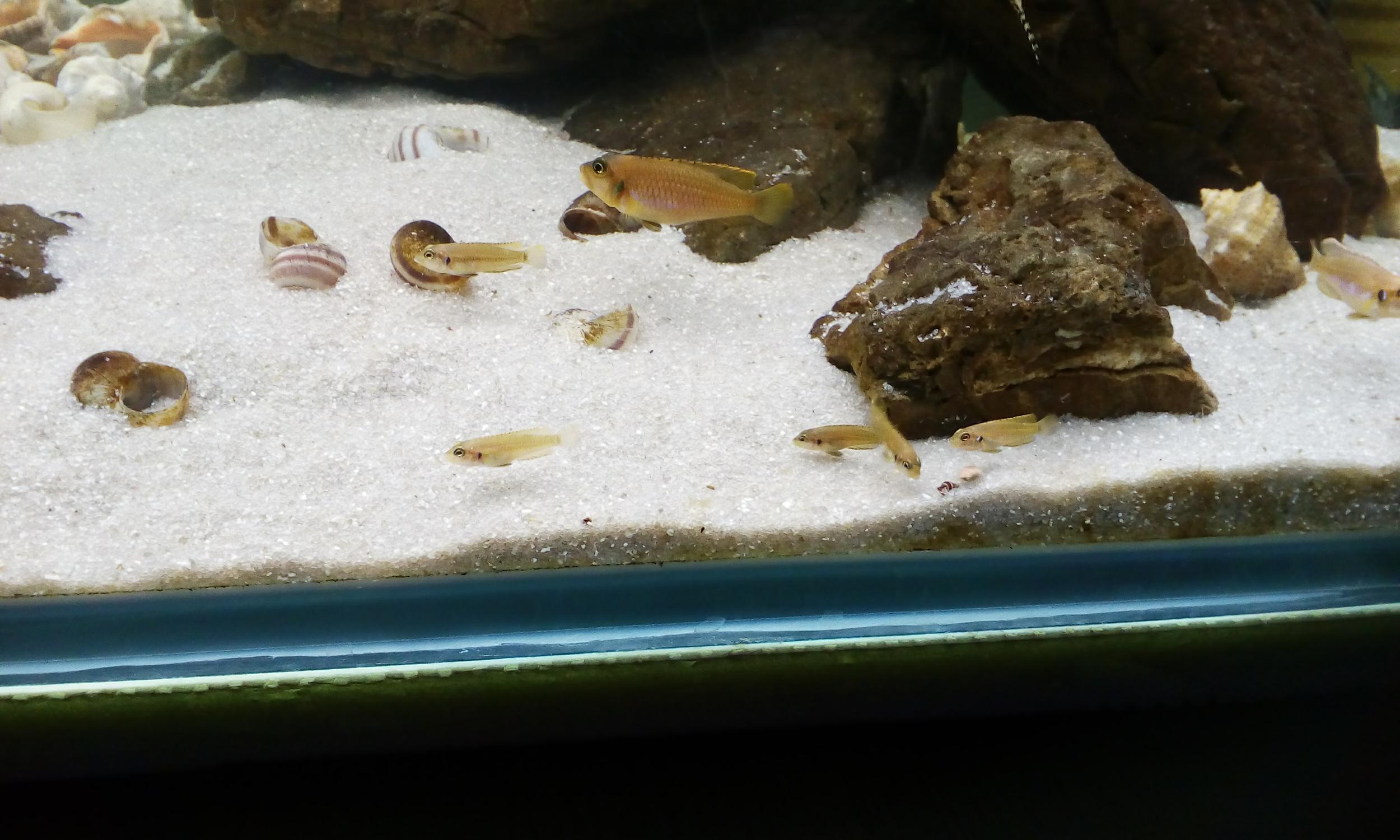 у Лампрологус оцелатус «голд» з'явилися знов малята, поки сидять в мушлі та випливають лише ловлячи корм. З попереднього виводку вижило та вже стали майже дорослими 5шт.