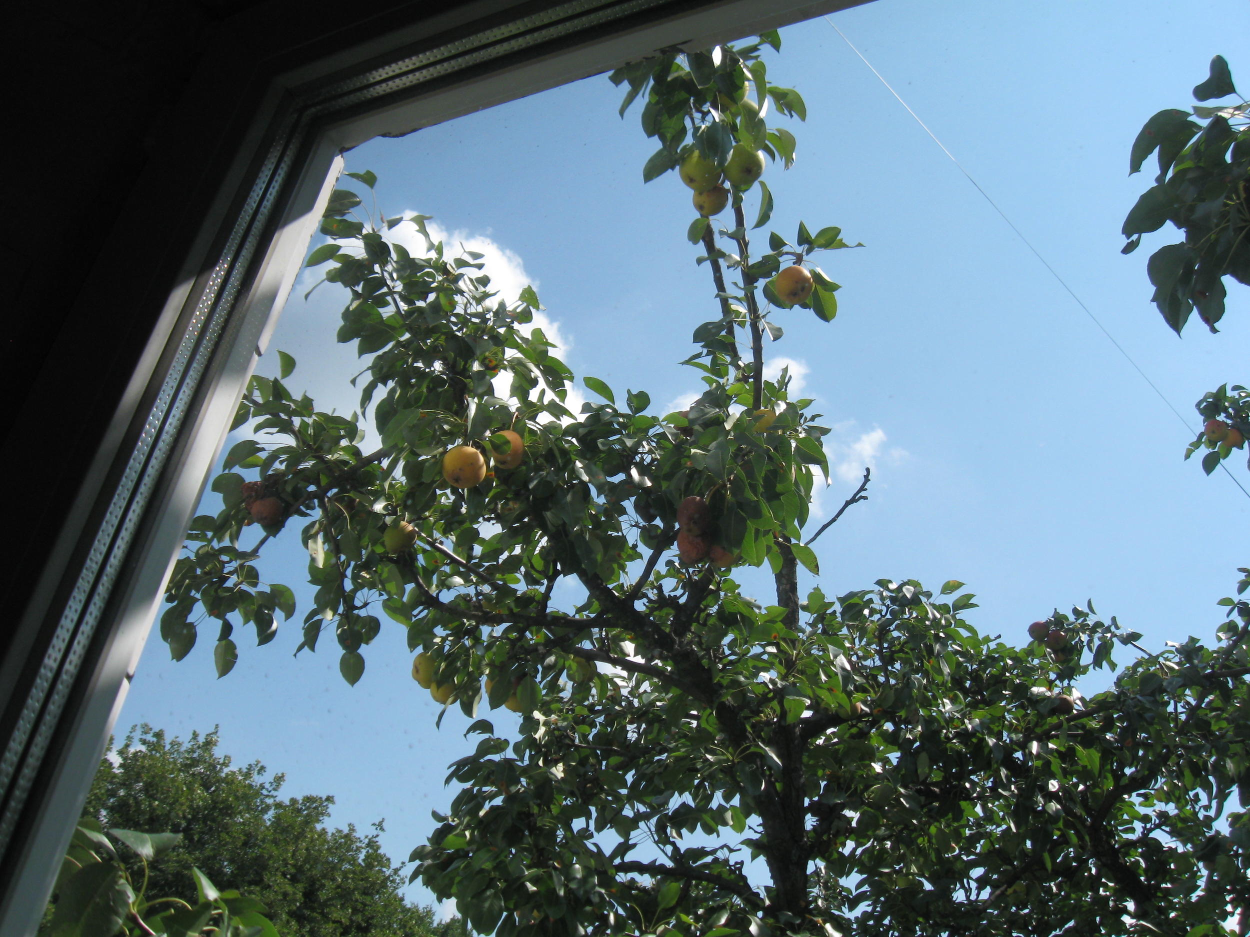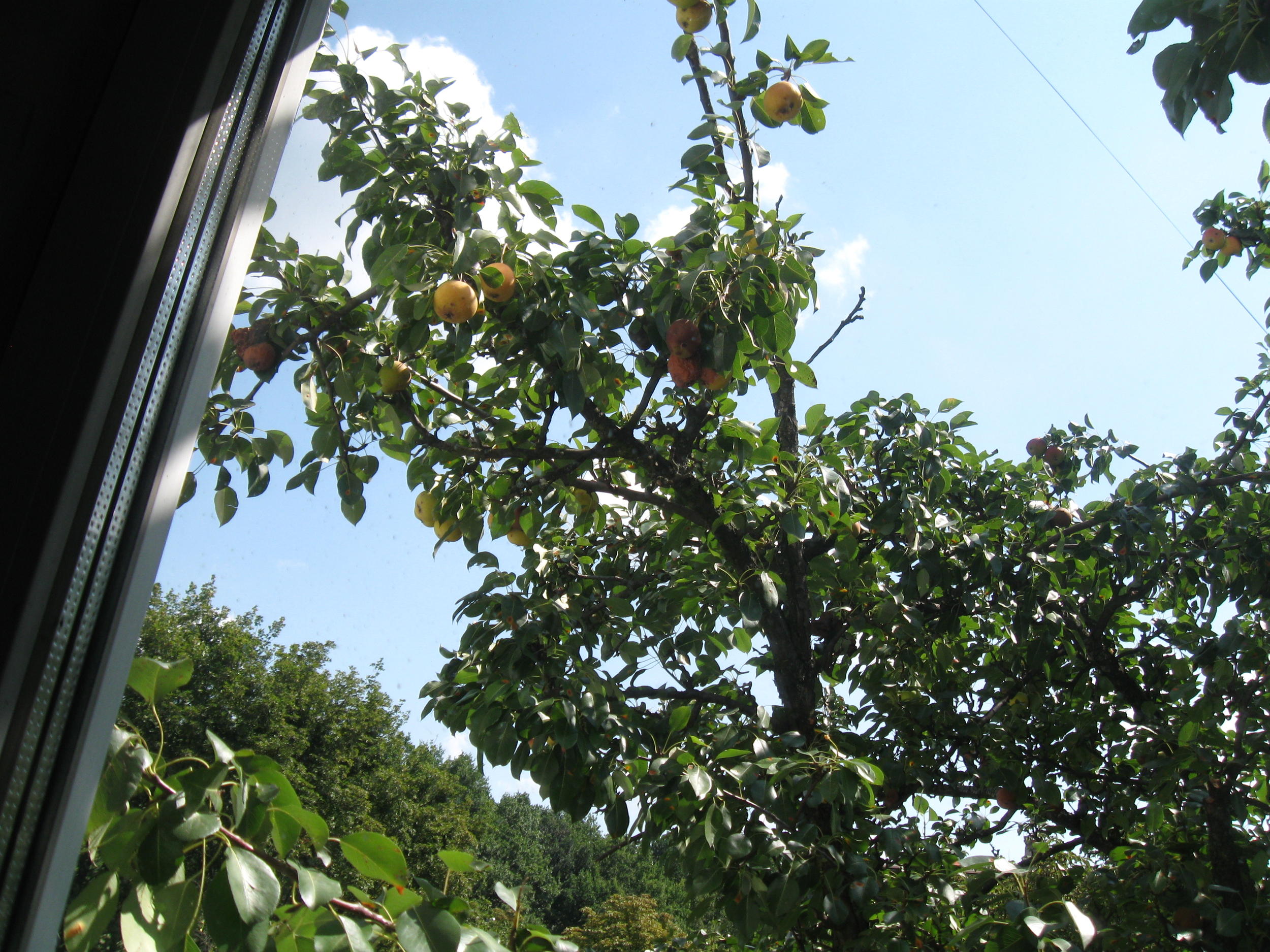 Наступил август.Груши прямо против окна на 2,3,4,5 этаже созрели.Стали сахарные.Конкуренты мне-ОСЫ-пчелы.Изготовил сезонный инструмент и начал сбор. И пусть груша по размерам не мичуринская.Но сладка и пора снимать,а то начали бухкать по ночам в подоконники