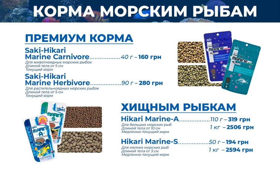 Saki-Hikari® Marine Carnivore и Saki-Hikari® Marine Herbivore Премиальный корм для морских рыб. Изготовлен из отборного сырья, содержат в своем составе пробиотики (полезная культура бактерий).