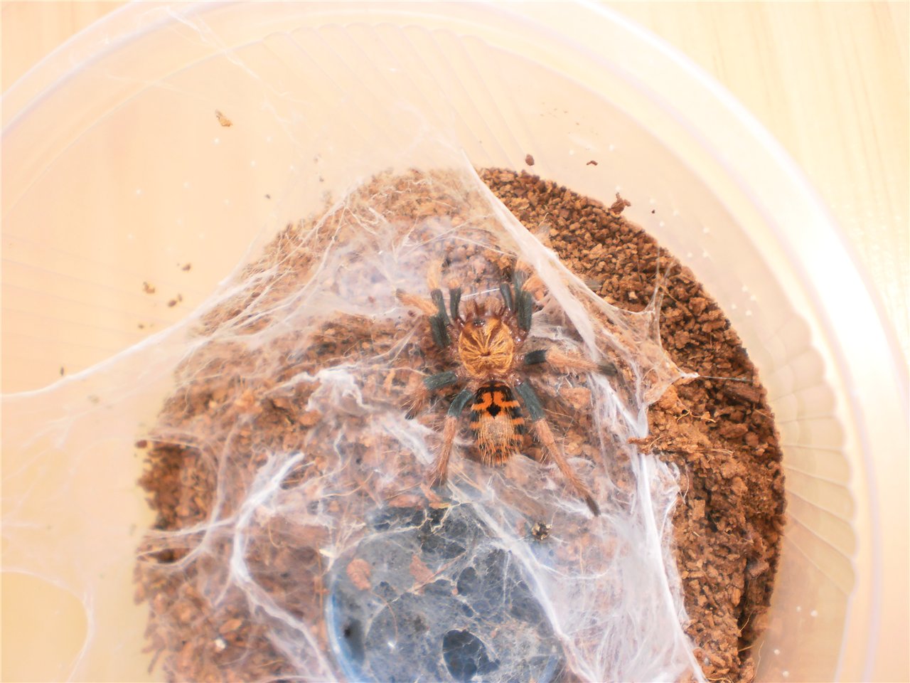 Примечание: Хроматопельма - "сухой" вид паука ,чрезмерное увлажнение может его убить . Плетёт очень много. Лучше держать без увлажнения грунта с поилкой.