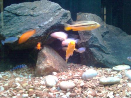 на заднем плане света ещё нет и потому не заметно что там ещё укрытий 6-8 между камнями и между задним стеклом и камнями, гротов бы добавил ещё но не хочу керамику или песчаник , будет както не в тему... попробую ещё гранита наколоть пластинами а то стрёмно уже камни туда наваливать и так вес приличный