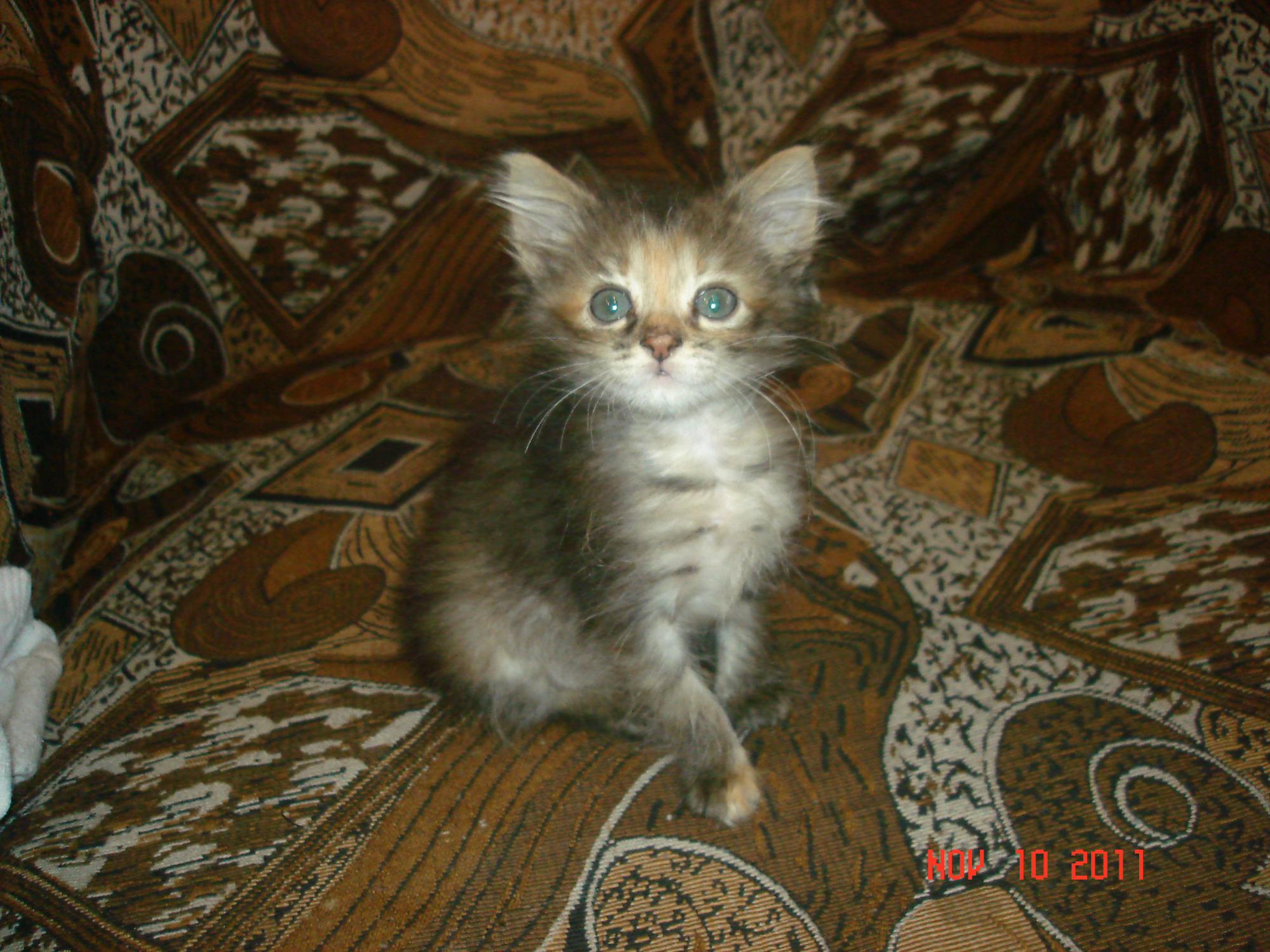 Нам в подъезд подкинули котенка. Вроде бы девочка, около 2-х месяцев - совсем малышка. Котенок рожден от домашней кошки, т.к. сразу же начал ходить в туалет в лоток. Ест сам, абсолютно все. Цвет приглушенно-серый, светлый животик и рыжеватая мордочка; немного пушистенький.