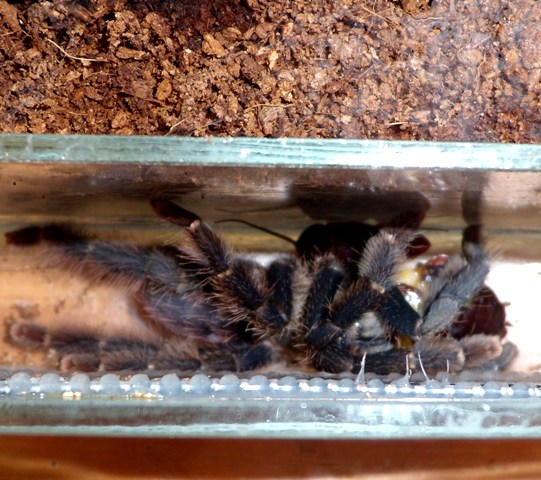 У меня некоторые террариумы снабжены передней вентиляцией ,планка , которая отграждает грунт от её отверстий ограничивает небольшой сектор ,куда я ложил таракана со вскрытым хитином и оторванными ногами. Паук в этом узком пространстве мог питаться, так как шевелящийся таракан не мог отползти при вращении телом в сторону , или перевернуться.