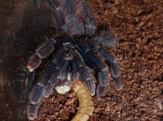 У меня сегодня первый удачный опыт кормления зверя. Вчера отказывалась, изменения в тере вызвали отказ от пищи. Я убрал из тера коряжку, и поставил капроновую крышку (что первое в голову пришло), ограничил совсех сторон свет плотной бумагой. Тарикам удалил лапки, вскрыл брюшки (резал маникюрными ножницами в виде ёлочки). Тараканы остаются живыми очень долго (что меня сильно удивило). Тараканов, как на тарелку ложу в капроновую крышку, где они пытаются передвигаться привлекая внимани паука. Только что наблюдал, как паук взял таракана и ест. Считаю это положительной динамикой