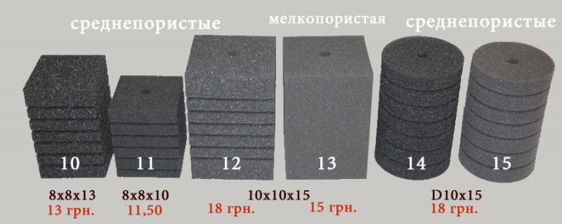 В наличие фильтрующие губки разных размеров, форм и пористости.