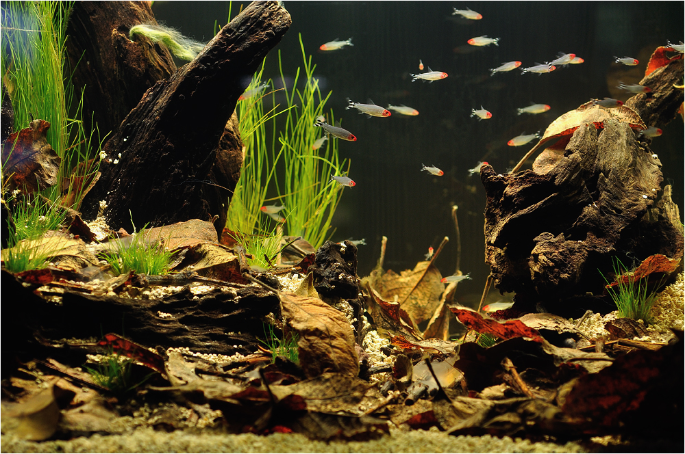 Листья положили в аквариум. Но неужели не знают уважаемые акваскейперы, что нужно подержать их предварительно пару дней в воде, что-бы они не делали воду коричневой и не заванивали аквариум?